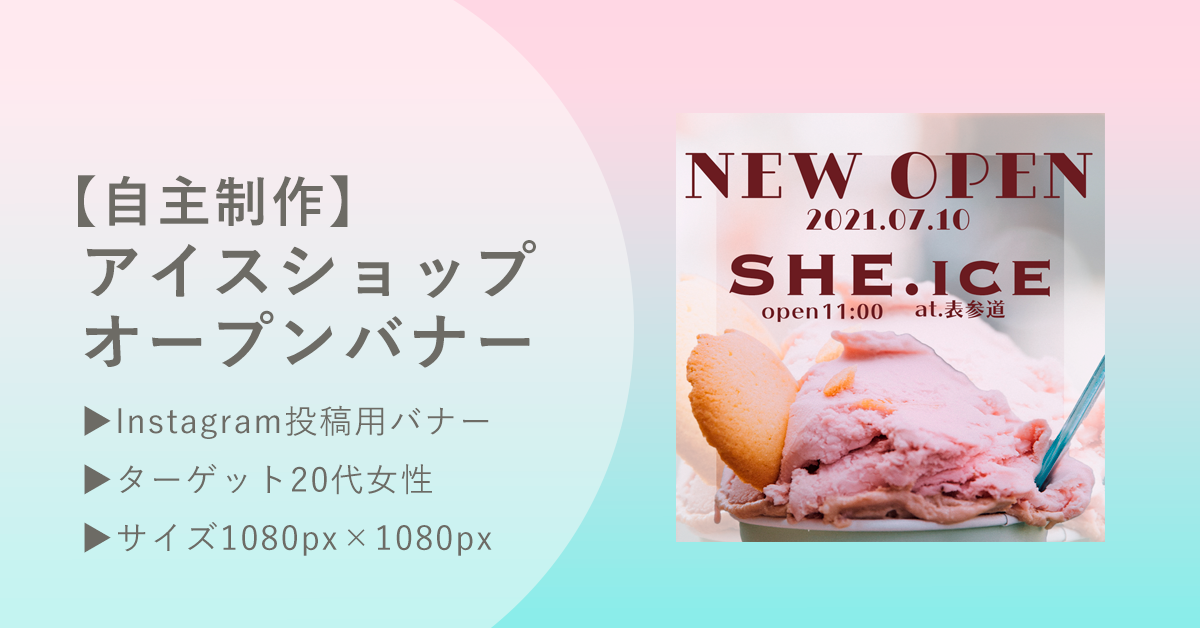 SHElikes会員コミュニティ内企画/与件:オープンのため認知度UP、インスタと相性の良い層のニーズを引き出したい/店舗の立地から20代女性が好みそうな表参道ヒルズのショーウィンドウをイメージ/女性らしい配色とフォントを意識