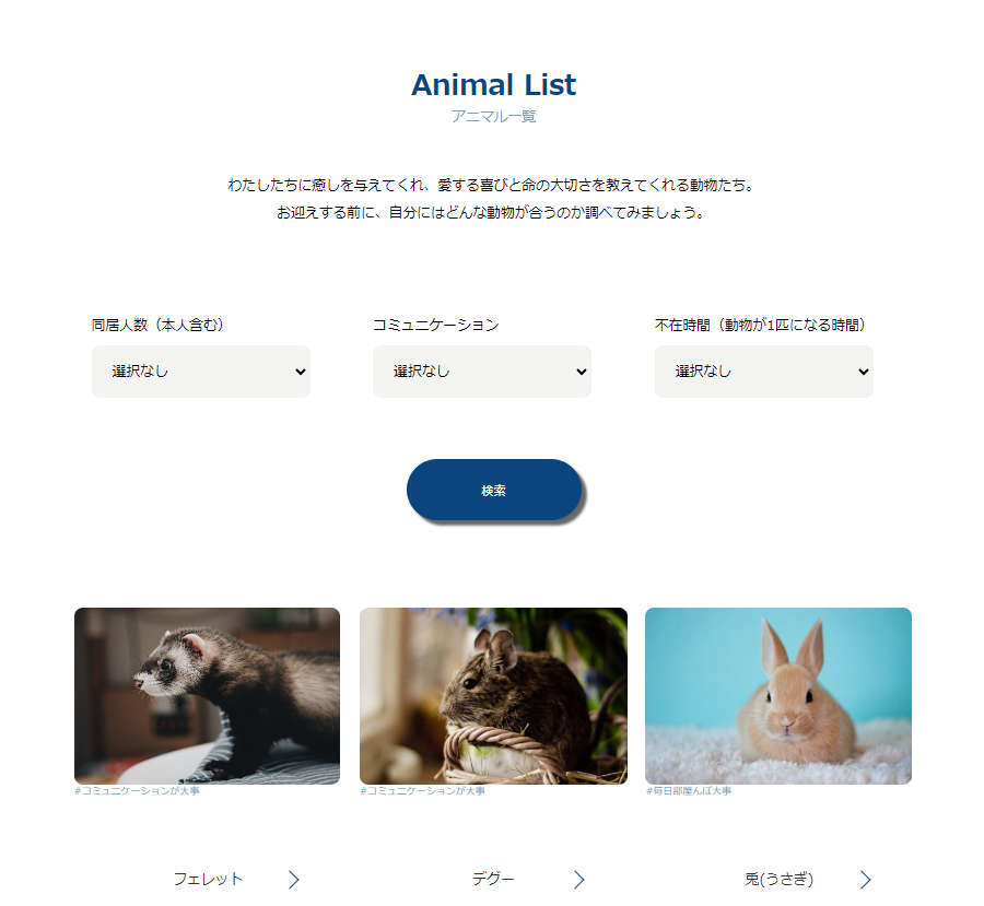 そこで、お迎えする前にお迎えする個体の特徴や情報が集まったサイトがあれば、お迎え後の飼い主と動物のミスマッチを防ぎ、ペットにとって幸せな未来が描けるのではないかと思い、サイト制作に至りました。