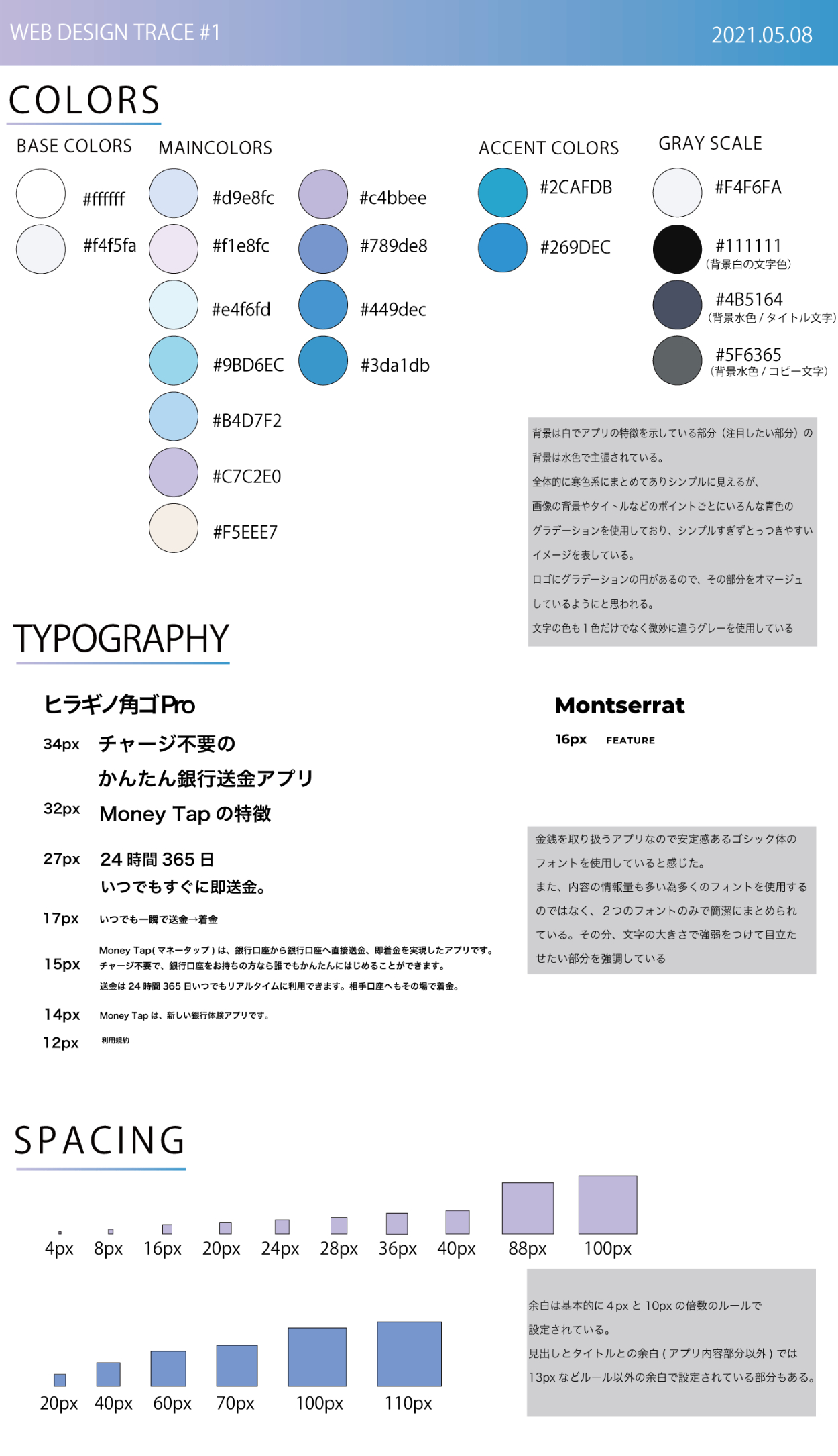 SHElikes MULTI CREATOR PROJECTの課題でMoney Tap様(https://moneytap.jp/)のページトレース・デザインガイドラインを制作・PCとスマホのデザインを比較・分析をさせていただきました。制作時間:24時間
