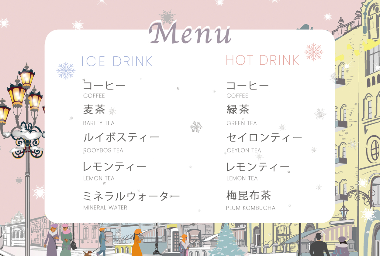全体に雪の結晶を散らして重ね、MENUの文字に雪が積もったような白のフォント