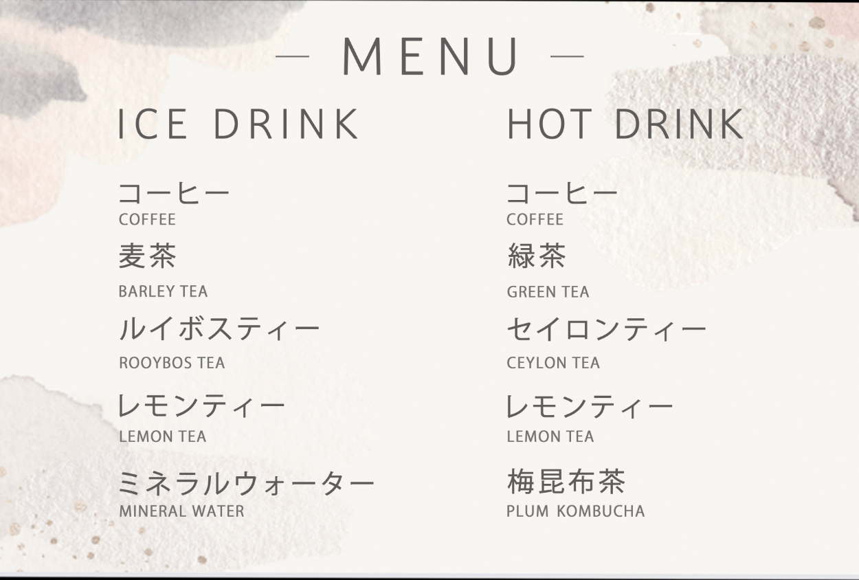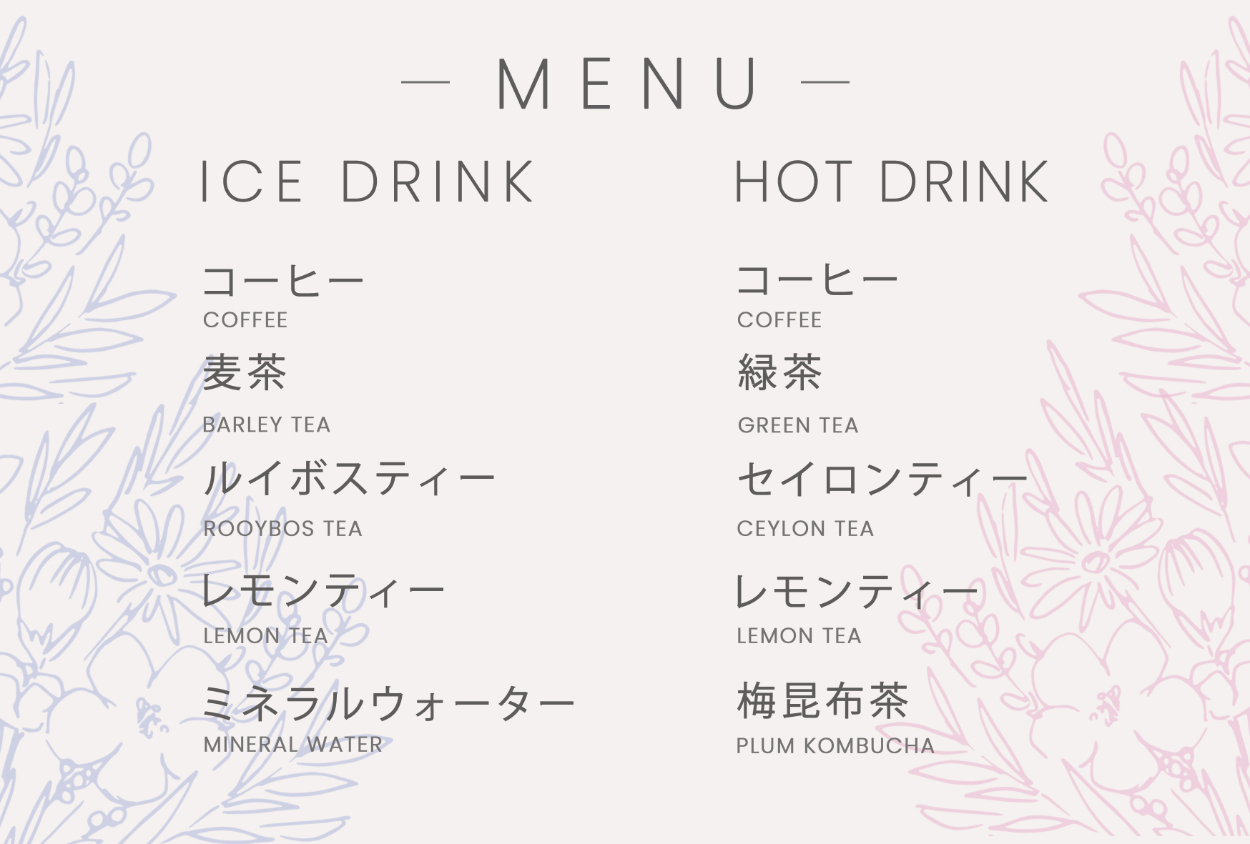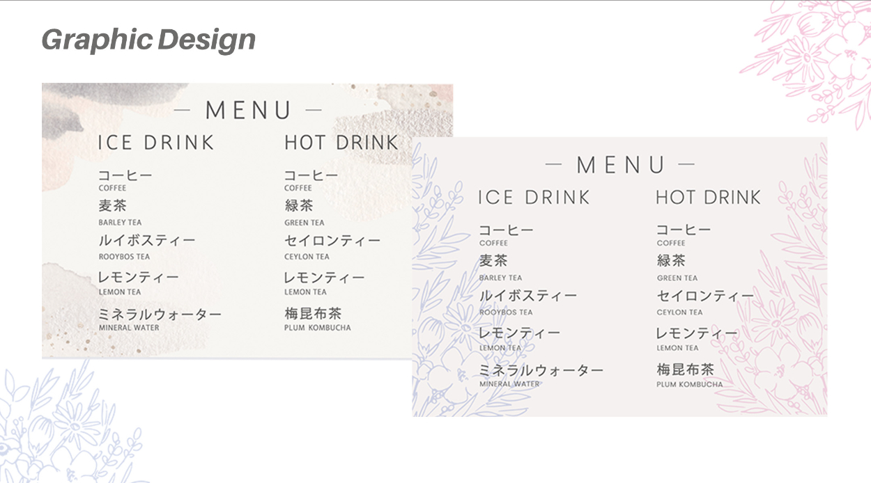 左のICE DRINKに寒色系、右のHOT DRINKに暖色系の「線画」で空間をもたせたフラワーデザインをあしらいました