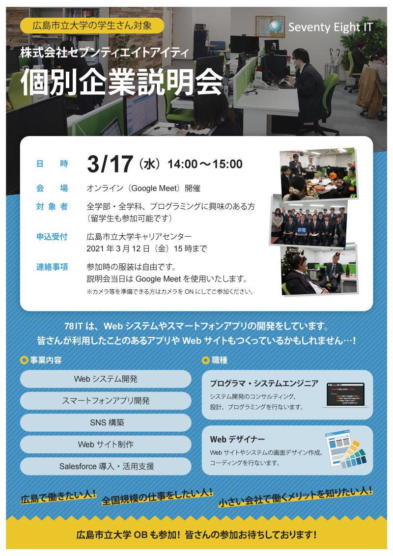 株式会社セブンティエイトアイティの大学生向け企業説明会チラシを作成しました。随所に斜めのラインを入れることで単調さを減らし、写真を多めに配置して堅苦しくかしこまったイメージにならないよう注意しました。