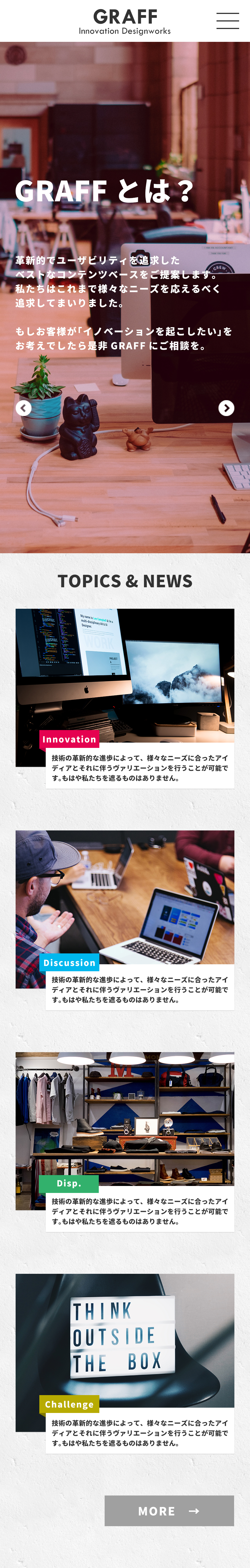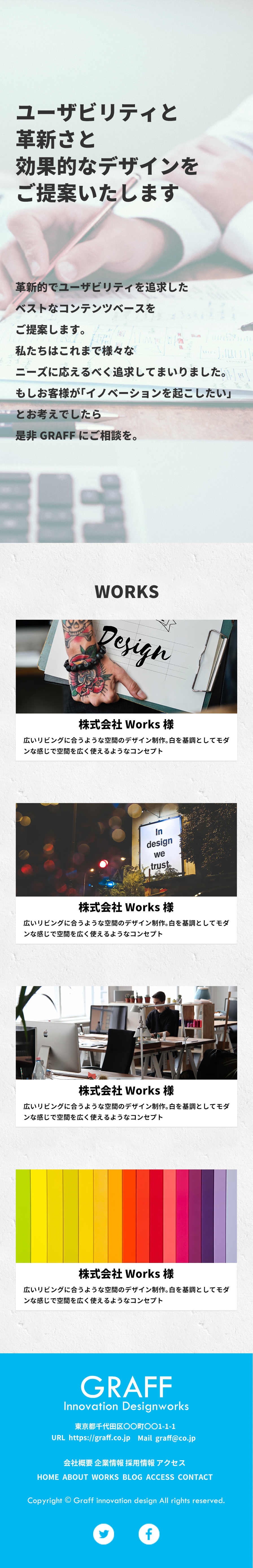 ②架空のデザイン制作会社のサイト(レスポンシブ) yui WEBデザイナー/エンジニア志望 OVERVIEW 架空のデザイン制作会社のサイトをイメージしてデザインカンプ制作しました。(レスポンシブ対応版)制作環境:Mac/Photoshop CC 2019 制作時間:約2時間 YEAR 2019