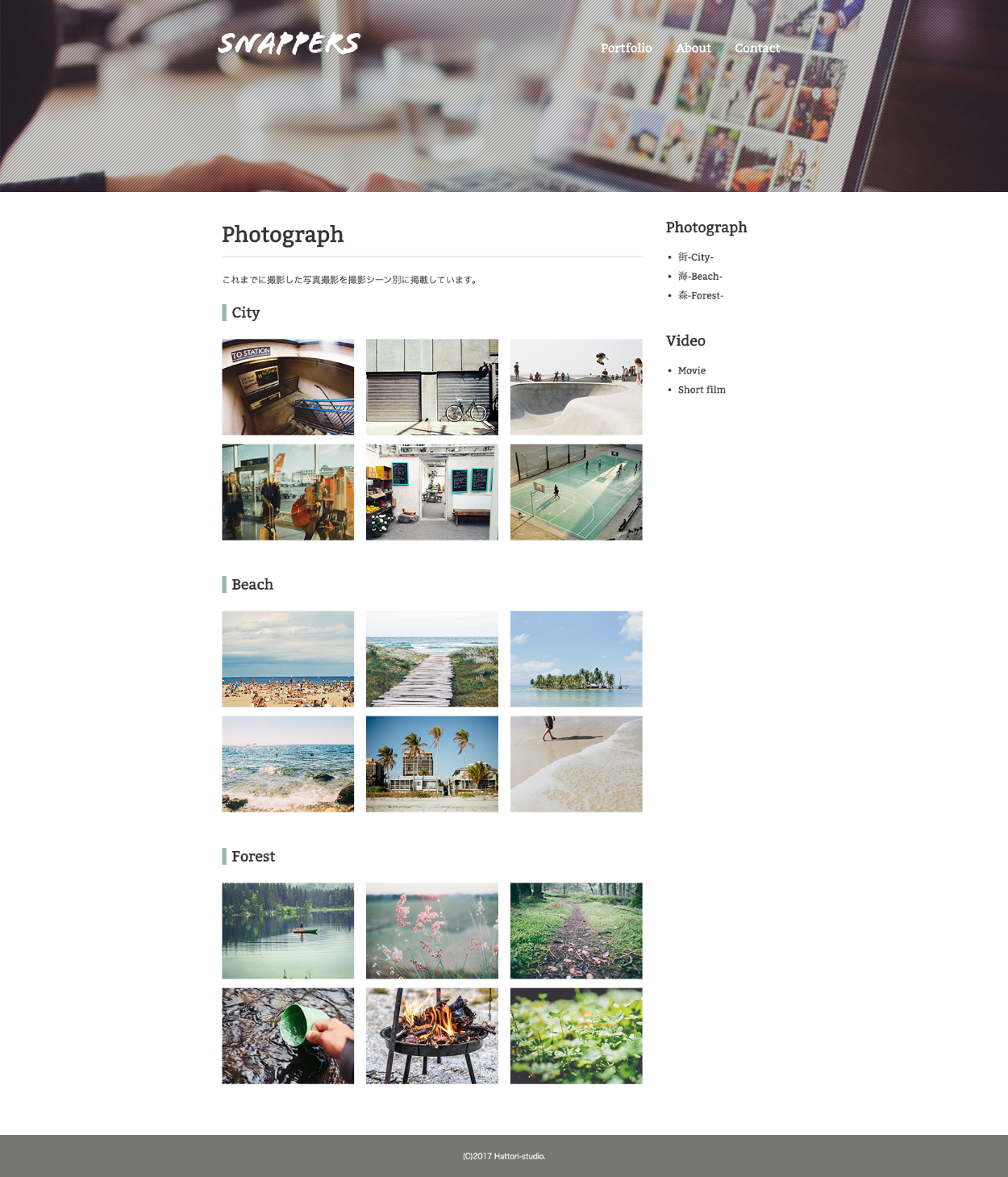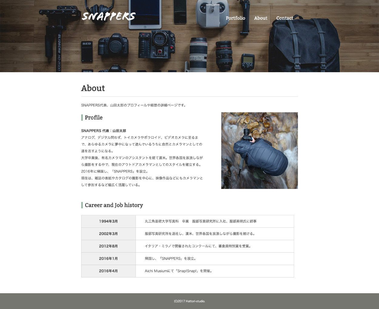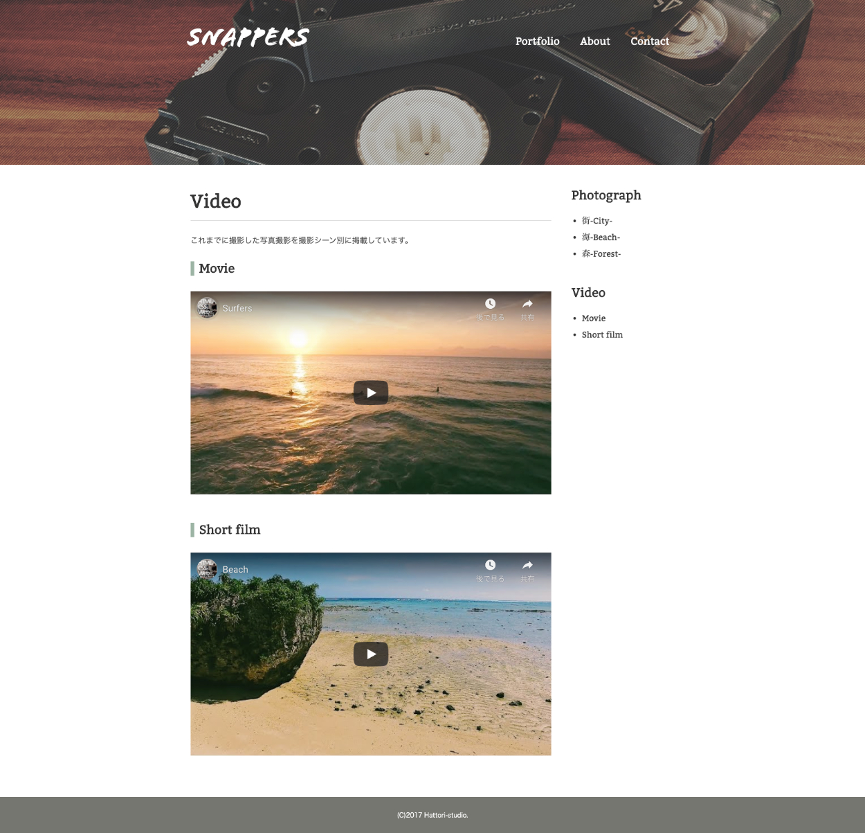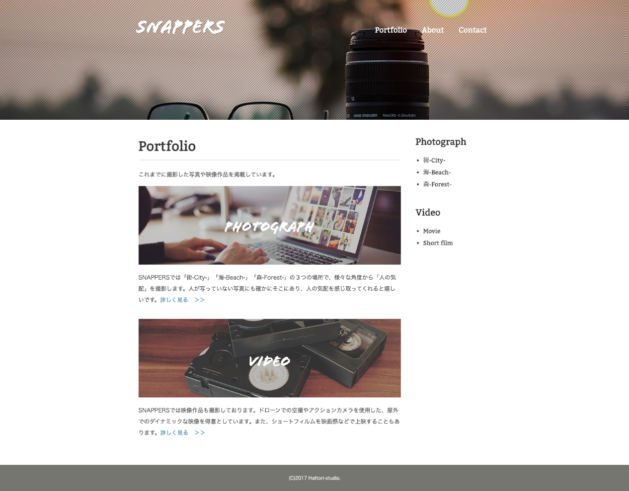 架空の写真家ポートフォリオサイト 山崎秀直 大学生 2019/3使用言語:HTML/CSSカメラに非常に興味を持ったことが一時期あった際に、このサイトを制作しました。YouTube動画、Google Mapの地図の埋め込みを実践してみました。このサイトで意識したことは、このサイトを制作する前に現在のウェブサイトはWordPressで構築しているサイトが数多くあることを知り、 WordPress化にできるように共通部分をできるだけ多くして比較的簡単にコーディングするように意識しました。サイトの詳細 WEBSITE