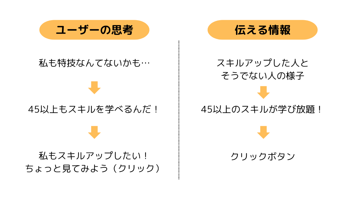 ・対比のデザインにすることによって、スキルアップした人の魅力を際立たせ「自分もそうなりたい!」と思ってもらえるように工夫しました。