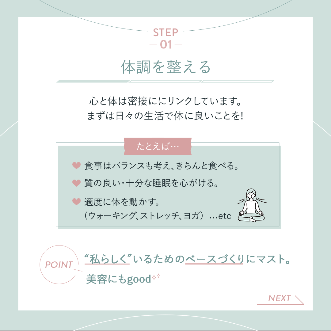 「体を整える→心を満たす→少しずつ前進む」というイメージで作成いたしました。