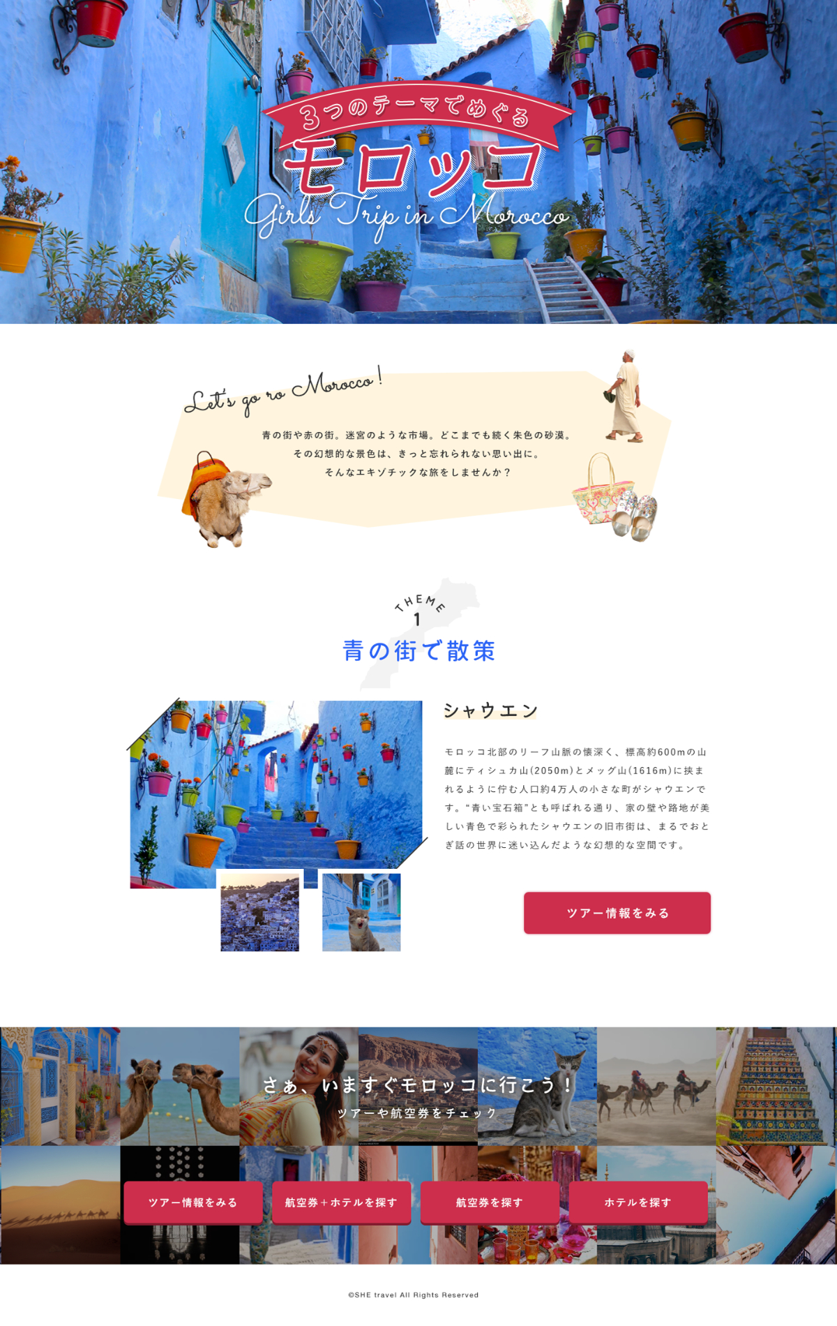(She likes演習課題)旅行サイトのトレース 井上 直美 webデザイナー OVERVIEW 架空の旅行サイトのデザインを、見本に沿ってトレースしました。 YEAR 2021 (練習内容)・長方形ツール・文字ツール(カーブ文字) ・クリッピングマスク・写真の色彩調整・写真の切り抜き