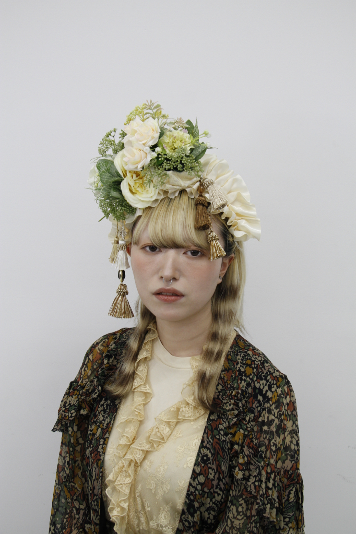 ヘッドピース 目羅帆ノ夏 専門学生 1960年代をイメージし、タッセルはアンティーク調のものを選びましたトーンは全体的に淡いイメージに合わせました。メイクはマット肌でチークとリップを基調にしたドール風に仕上げました。