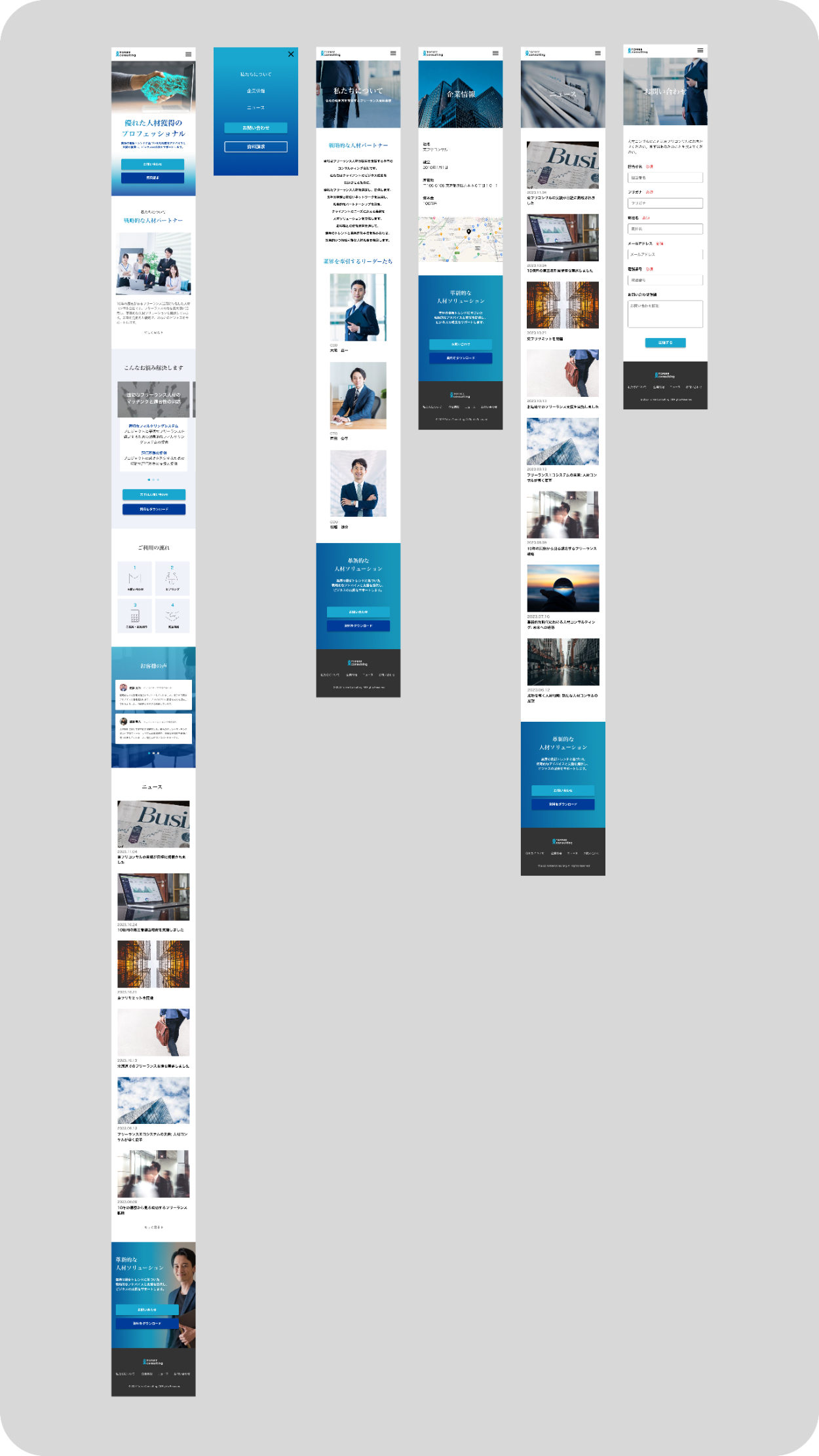 トップページ、NEWSページ、ABOUTページ、会社情報、お問い合わせページ