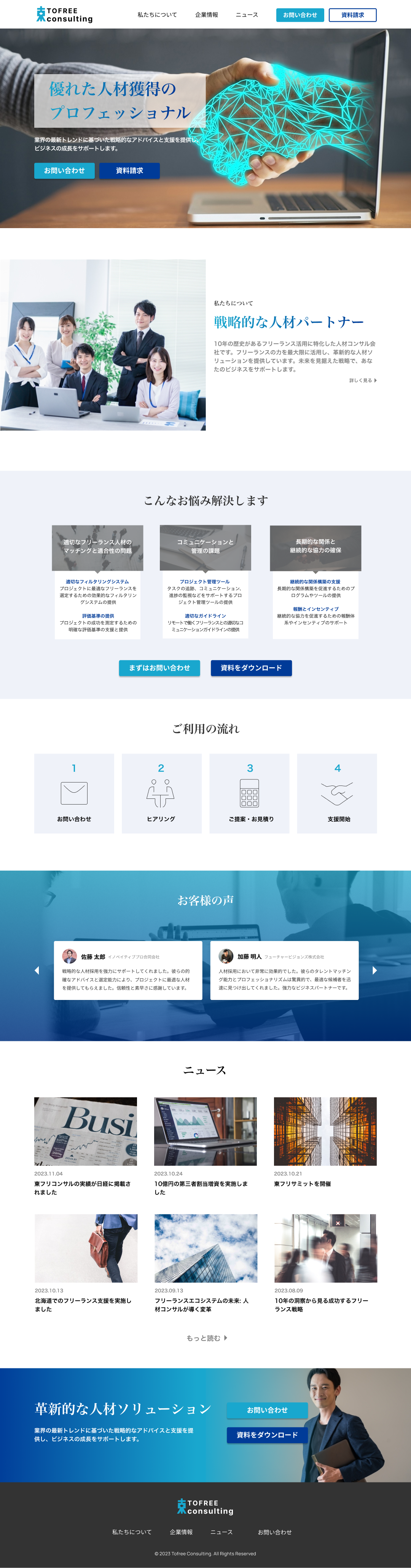 フリーランスの活用をコンサルする企業のコーポレートサイト。ITに疎い企業を相手にフリーランスのエンジニアやデザイナーを紹介、活動支援を行っている。