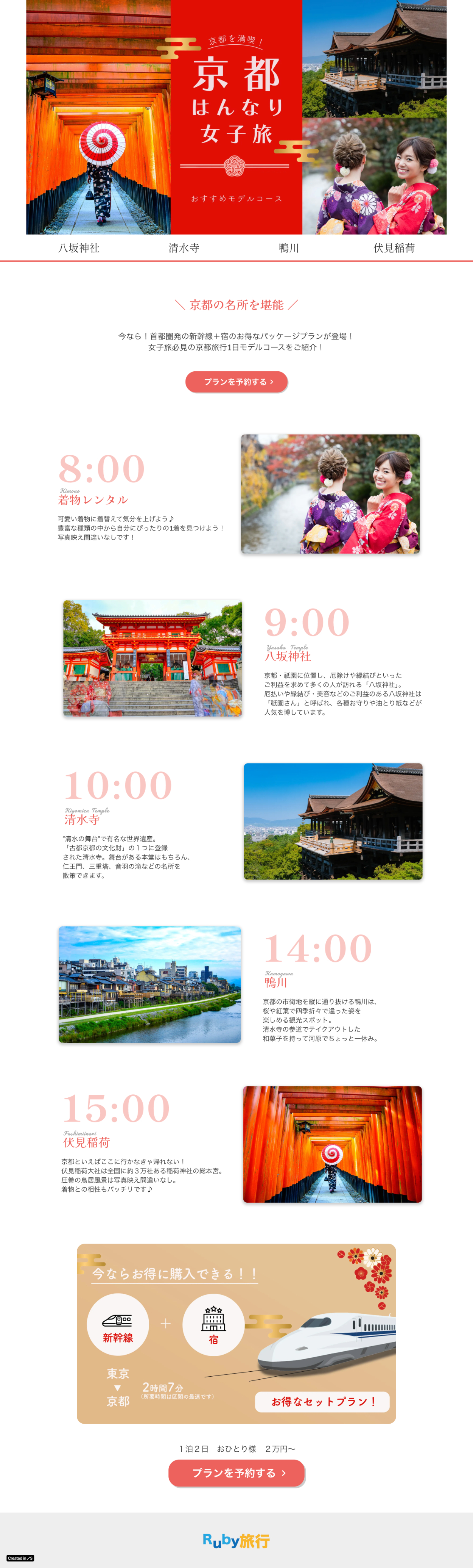 HerTech Webデザインコースの課題で架空の新幹線+お宿の旅行パッケージプラン誘導LPを作成しました。【制作期間:1週間】【使用ツール:Photoshop、STUDIO】