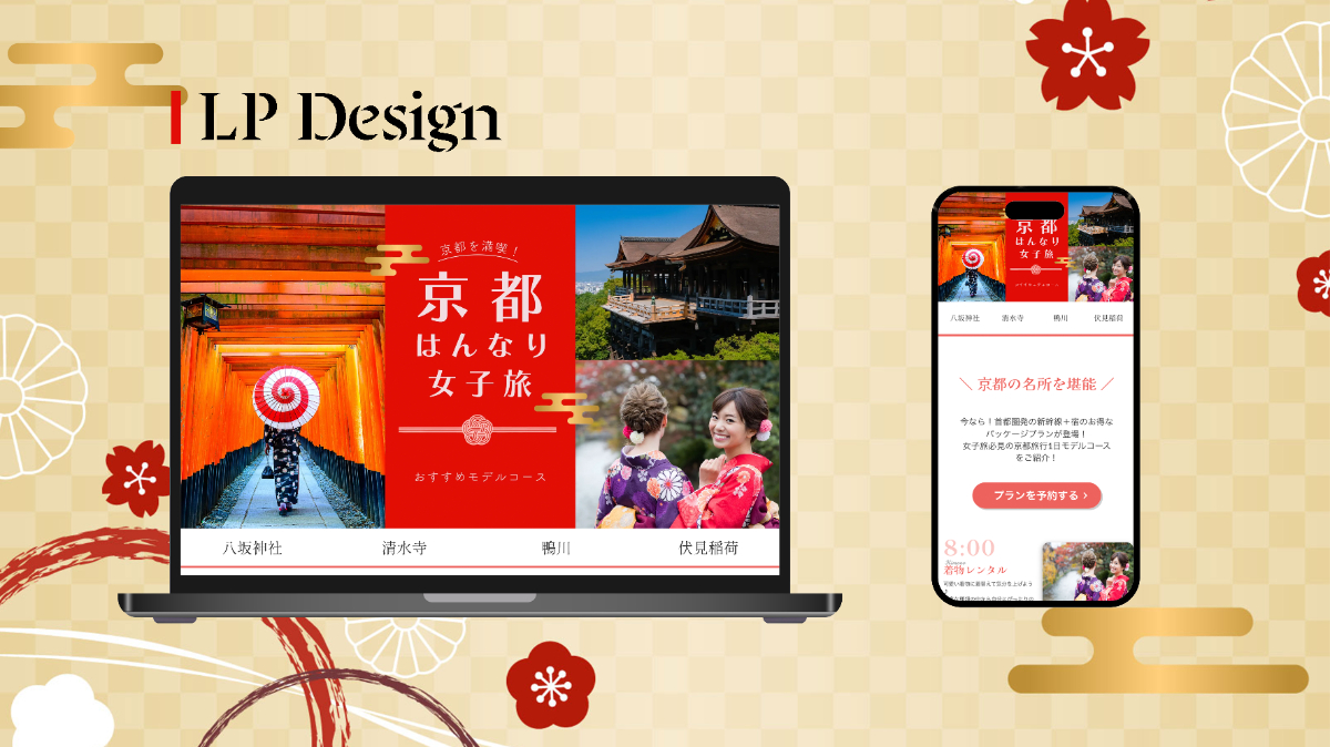 アクセントカラーの二色は、京都らしい上品さ×はんなり和風テイストをテーマに赤を基調とした和風テイストのL Pを作成しました。ペルソナから仕事や人生に情熱的な人という印象を持ち、①【赤とオレンジの中間くらいの色】を最初に選びました。明るい色を使用するものの落ち着いた印象にしたかったため、もう一色は①の彩度を低くしたカラーを選びました。