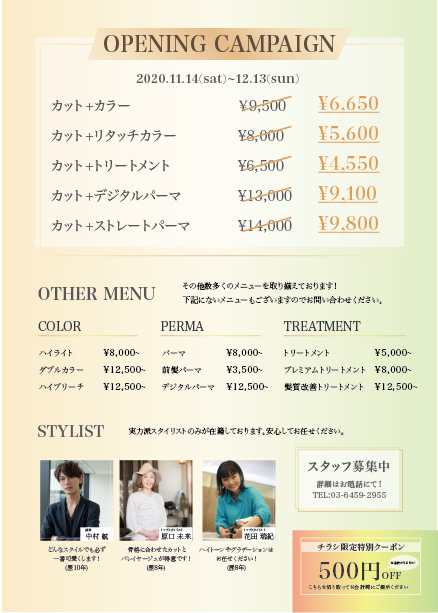 SHElikes 【MULTI CREATOR COURSE】の課題で架空ヘアサロンのオープンキャンペーンのフライヤー制作を行いました。(制作期間:5時間)