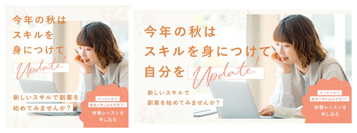 女性向けキャリアスクールのキャンペーン訴求の広告バナーを想定。要件定義、情報設計、ビジュアルデザインを検討し制作 。 [制作時間:5時間 / 制作期間:2日/使用ツール:Photoshop]