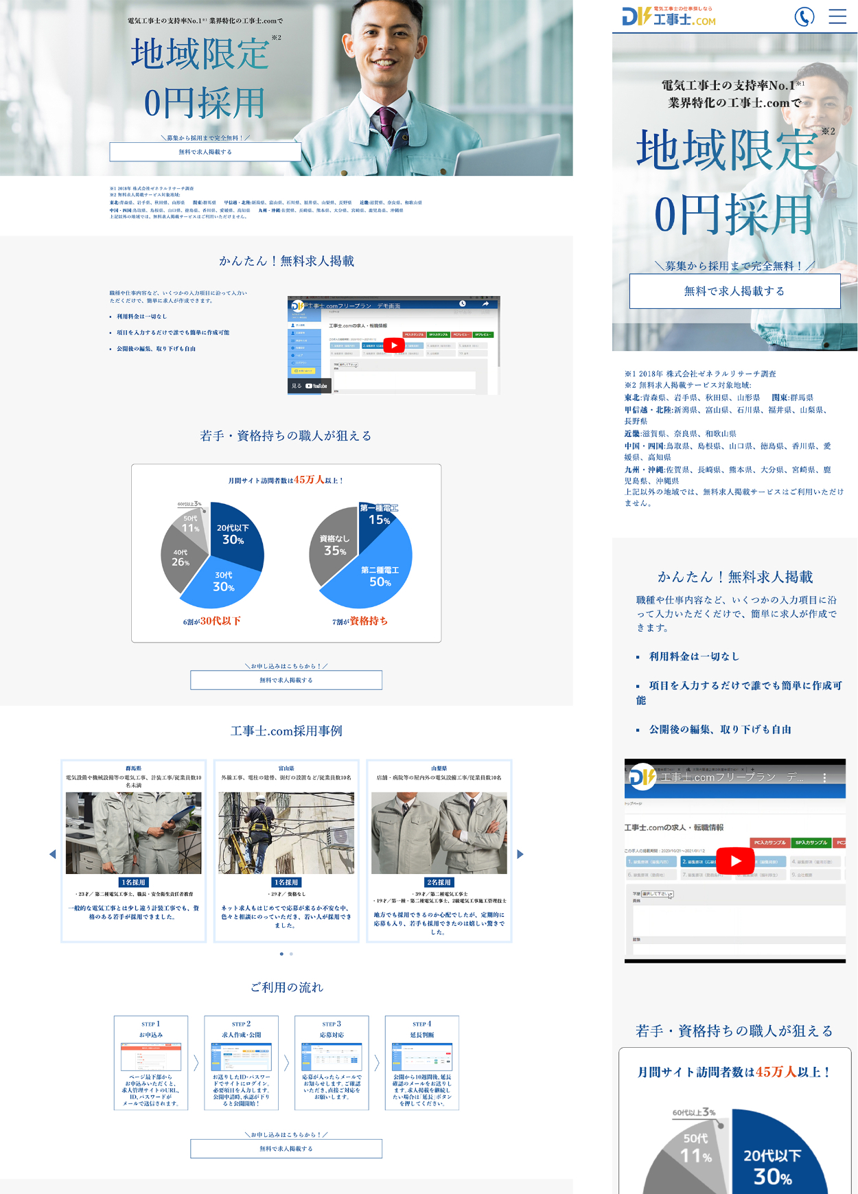 企業様ご自身で求人情報を入力いただくことで、求人サイト「工事士.com」に無料で求人が掲載できる地域限定のサービスです。 インハウスデザイナーとして、LPサイトのデザイン、コーディングを担当しました。