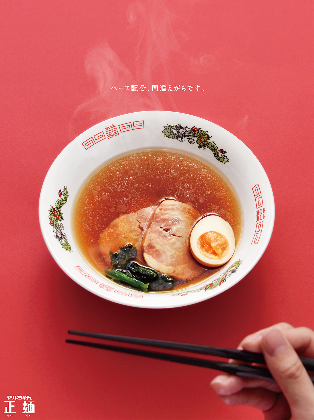 ペース配分を間違えてしまうほど、おいしい麺が特徴のマルちゃん正麺を表現しています。