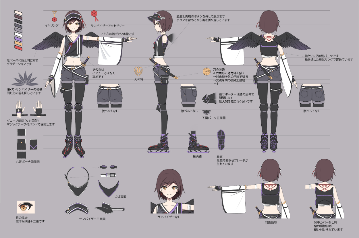 キャラクターデザインシートです。注記がある場合を除き、制作時間はキャラクターデザインの時間を含みます。過去にデザイン済みのキャラクターを描いたイラストでは、キャラクターデザインの時間を除いた時間である旨を記載しています。