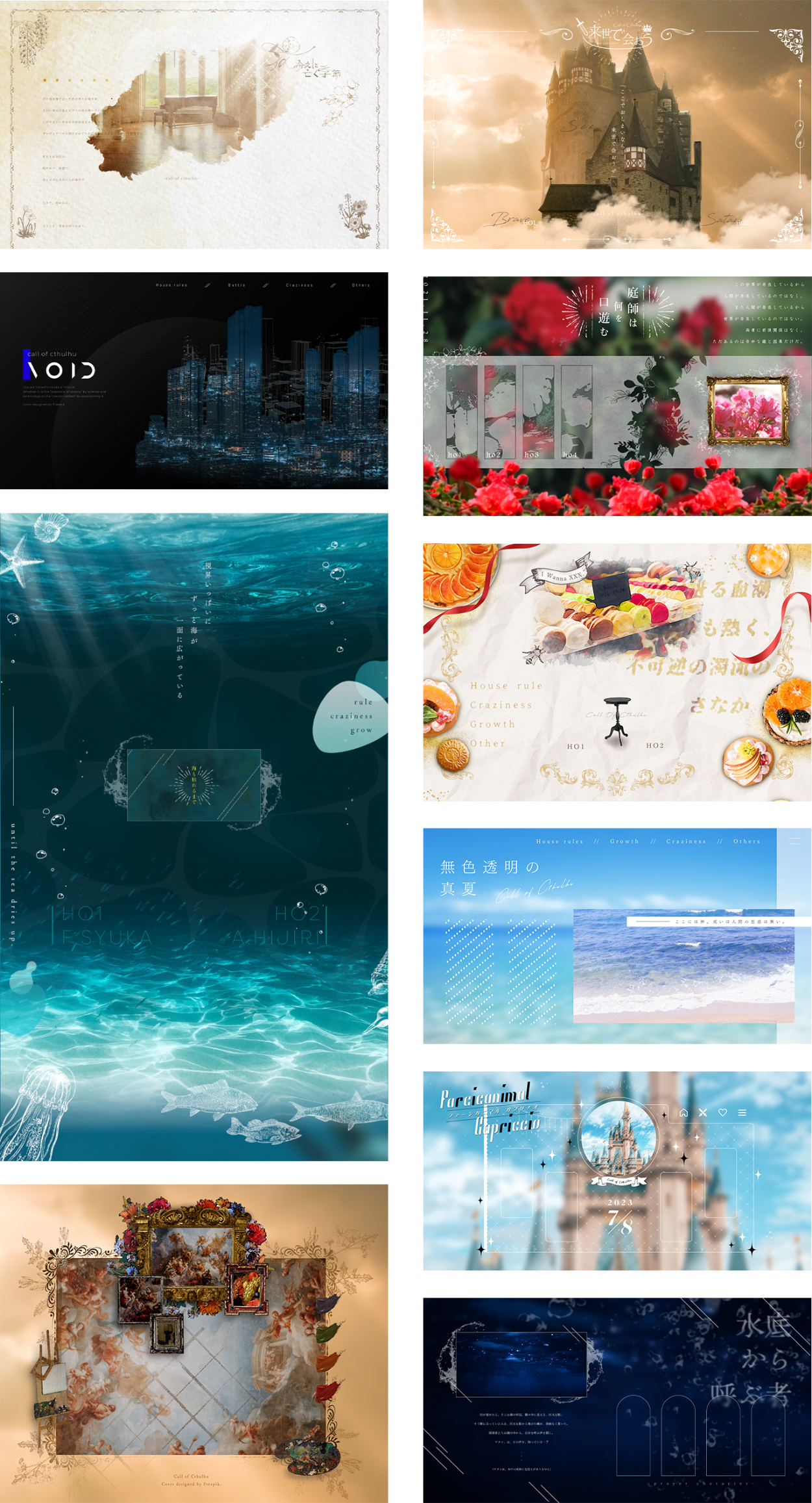オンラインセッションツール「ココフォリア」内で作成できる画面のデザインを制作。 世界観を崩さず空間を感じさせる構成を意識し作成。閲覧する人に楽しんでもらえるようなデザインになるよう仕上げた。