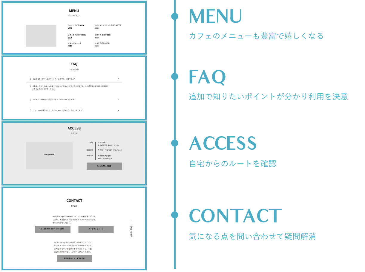 ペルソナは仕事が忙しい中でカフェ&コワーキングスペースを探していると思われるため、クライアントから提示されたワイヤーフレームを大幅に見直し、離脱されにくいサイトを目指しました。