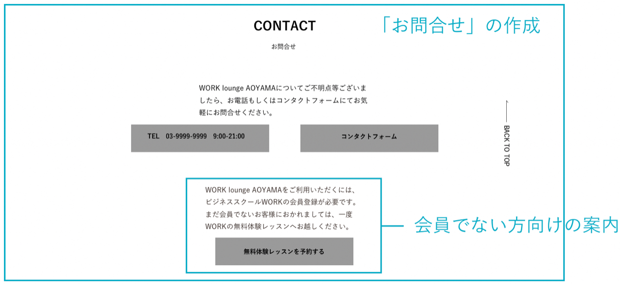 ユーザーの疑問を解消できる窓口は必須だと考え、「お問合せ」を新たに作成しました。また、そもそもこのカフェ&コワーキングスペースはビジネススクールWORKの会員でないと利用できないため、会員でない方向けに無料体験レッスンの予約ボタンを追加しました。