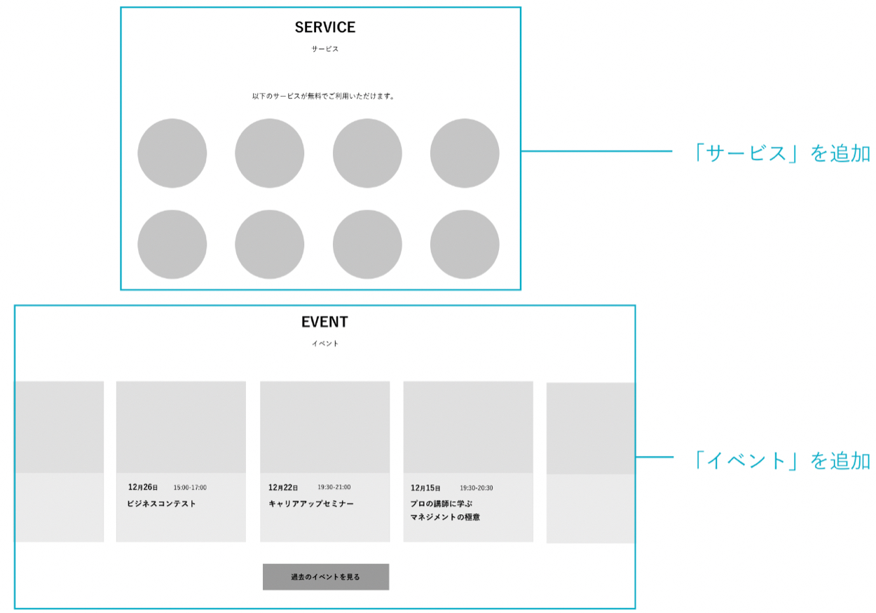 ユーザーがカフェ&コワーキングスペースの利用を検討する際、サービス内容は重要な判断軸になると考え、コンテンツに「サービス」を追加しました。また、会社外での人脈作りを求めているペルソナが関心を持ちそうな「イベント」を追加しました。