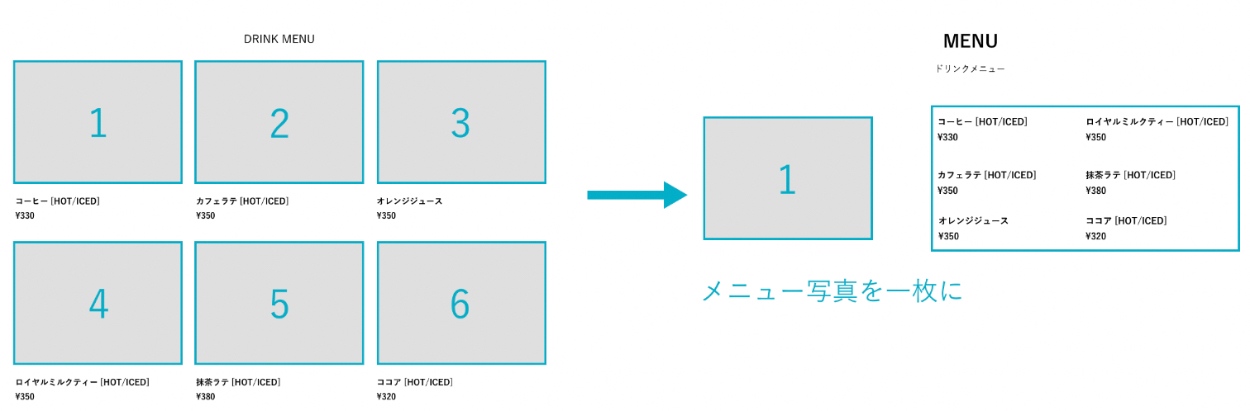 今回のペルソナはカフェのメニューをそれほど重視していないと判断し、写真は一枚のみにしました。