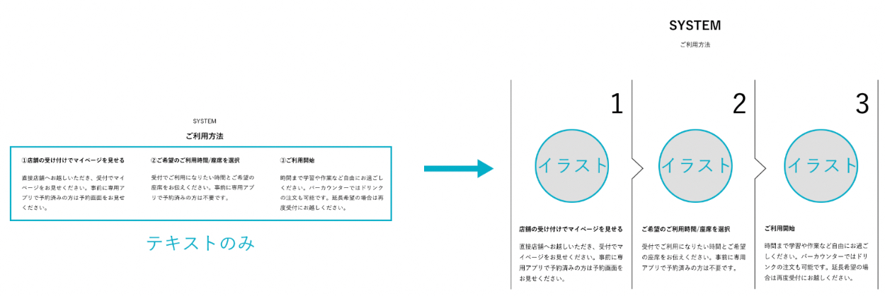 利用方法がテキスト説明のみだと億劫に思われるため、イラストを取り入れて3ステップで完結することを強調しました。