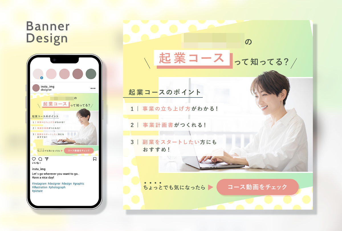 WEBスクールの「起業コース」CRM配信を想定したバナーを制作いたしました。 【制作時間:8時間 / 制作期間:1週間 / 使用ツール:Photoshop】