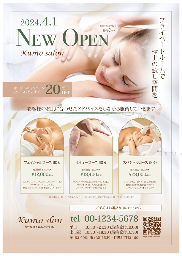 背景に白いバラの写真を使用し、グリーンの色合いも濃い深みのある色を使用することで、エレガントさをだし、メニューの部分の枠もお城のドアをイメージして作りました。高級感があり、キャッチコピーにあるように、極上の癒し空間となるよう表現いたしました。また、新規顧客・認知獲得の目的にあわせ、電話番号を大きくしました。