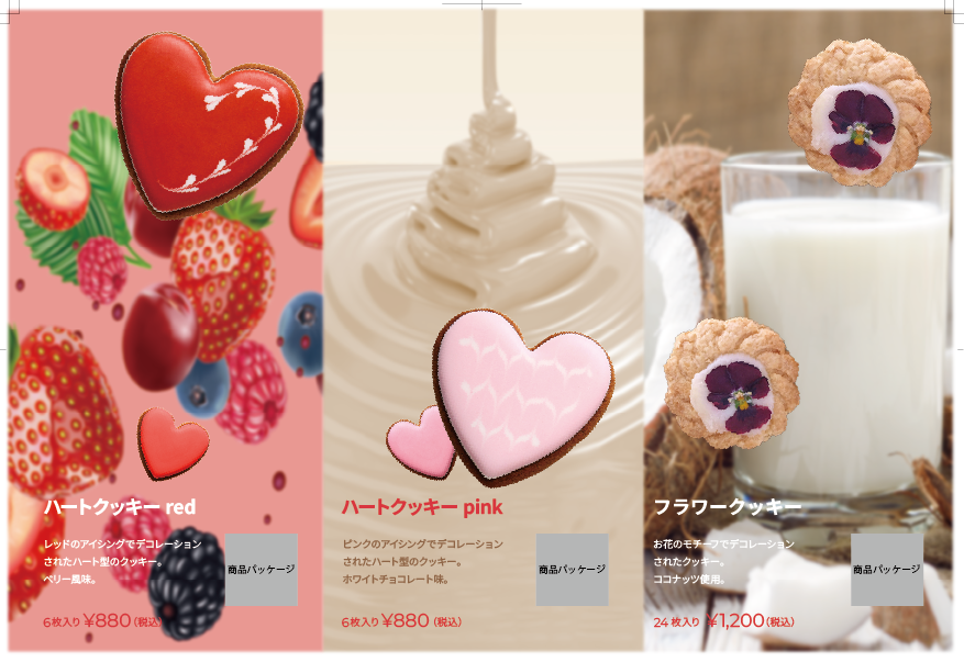- 直感的に印象に残るデザインにしました(バレンタイン、限定、クッキー、フレーバーなど)。