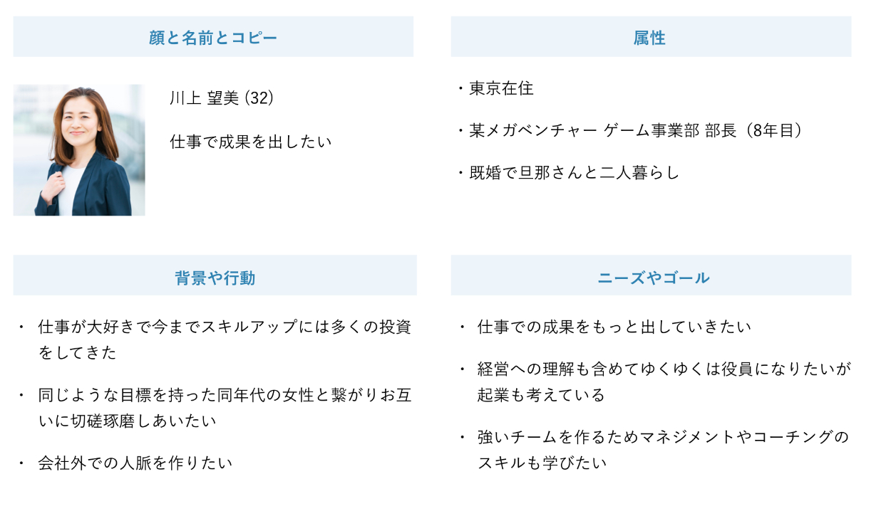女性向けのビジネススクールを展開している。会員は20~30代の女性が多く、キャリアアップのためにビジネススキルを学び、さらにそのアウトプットの場として定期的にビジネスコンテストなどのイベントも 開催されている。