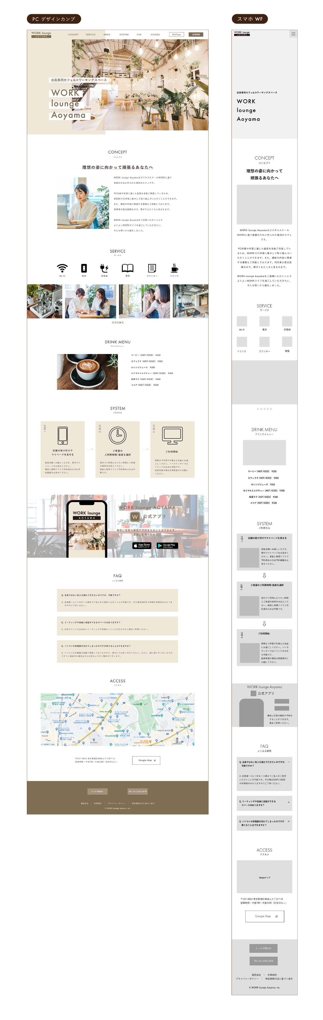 SHElikes MULTI CREATOR COURSEの課題で、ビジネススクール会員限定のカフェ&コワーキングスペースのLPを制作しました。PCデザインカンプとSPワイヤーフレームをデザインしました。(制作時間: 40時間/使用ツール: Photoshop)