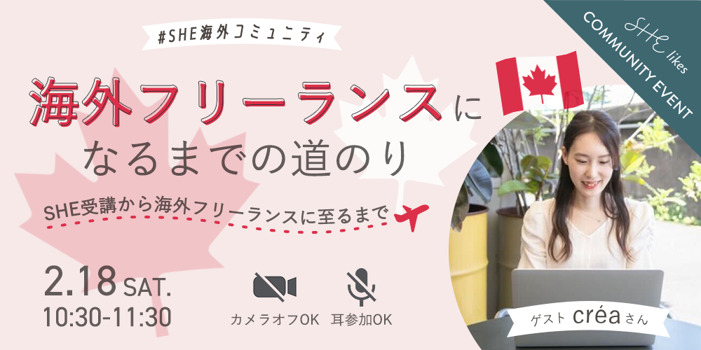 【制作実績】オンラインイベントの告知バナー 伊藤真莉 Web系フリーランス OVERVIEW SHElikes海外コミュニティのイベント告知用バナーを制作しました。 YEAR 2023 デザインアイデア登壇者の方のやわらかく明るい雰囲気、カナダで活躍されていることを色合いやカエデのあしらいで表現しました。