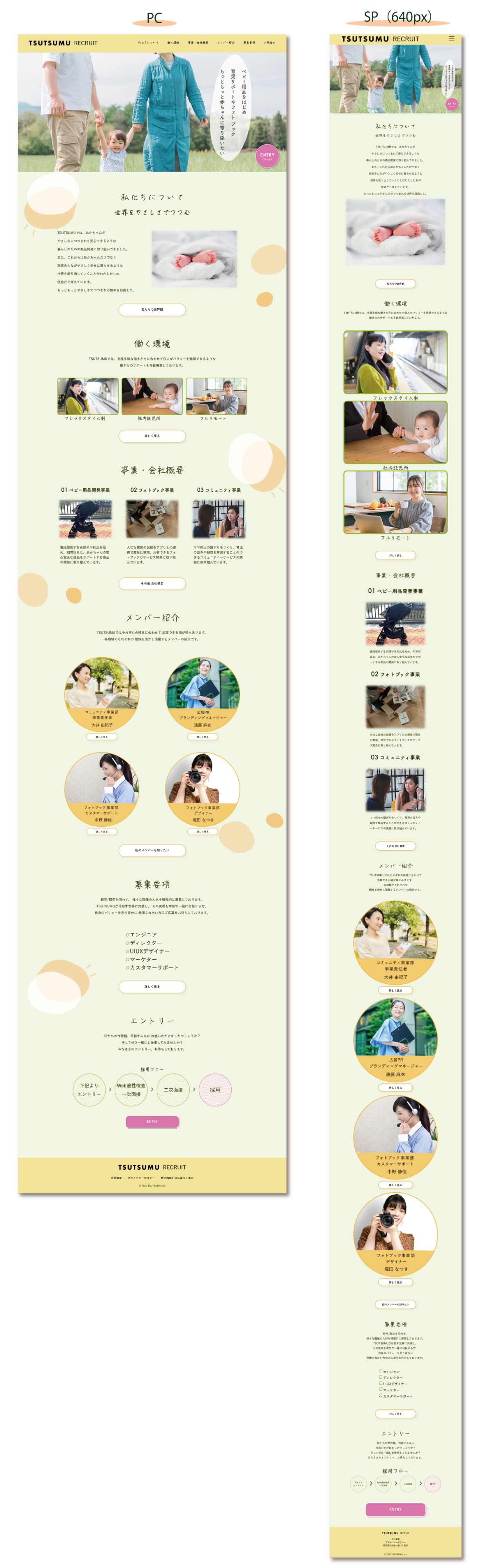 ★コンセプト:トンマナの設定通り、新芽の絨毯(背景カラー)にしました。あしらいには陽だまりのほんわか手書きのような丸と雲のような白をランダムに配置し、温かみを演出しました。また、リクルートサイトであるため、2種のエントリーボタンは、正円と角丸の四角にし、緩さではなく、ゴール時点では覚悟が決まった応募する気持ち表現しました。さらに最下部のボタンに付けたホバーは、ドキドキの気持ちを乗せ、心臓の様な動きにしました。