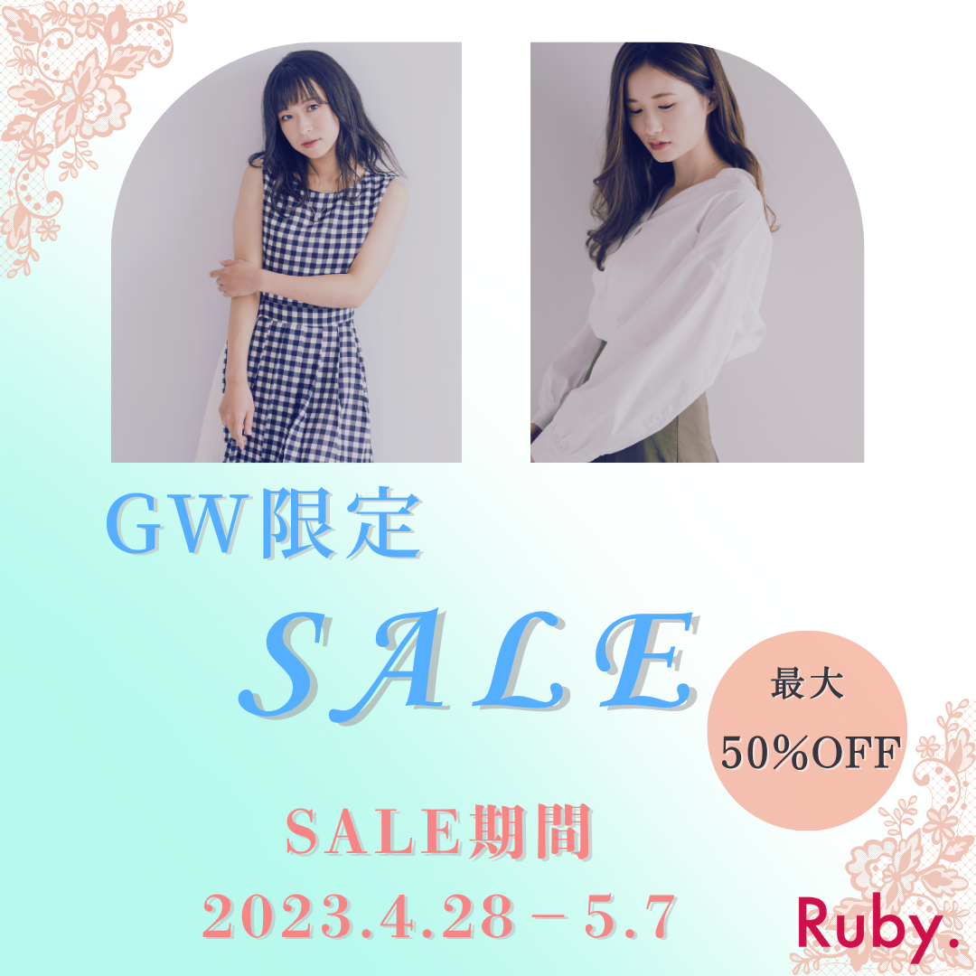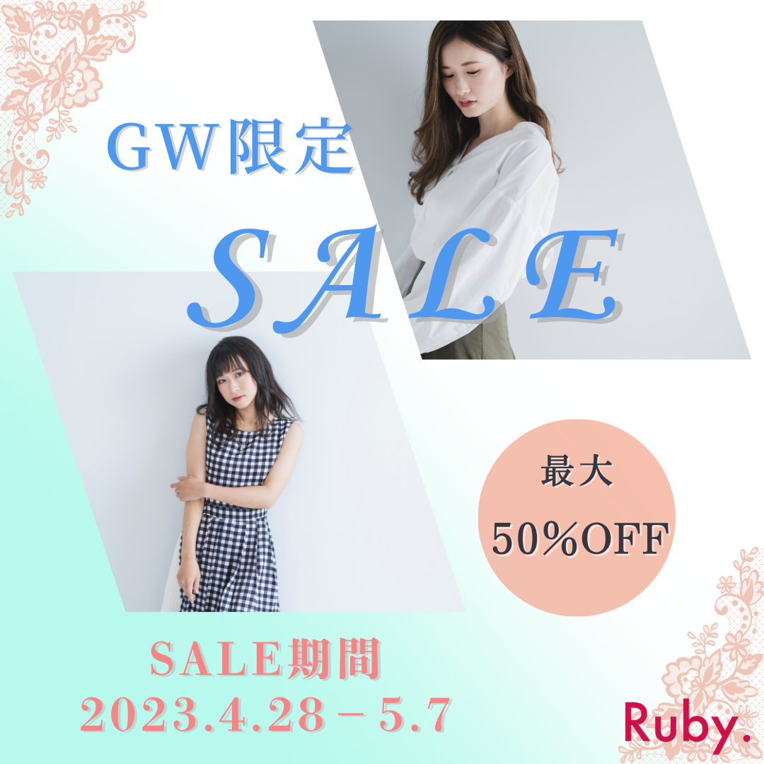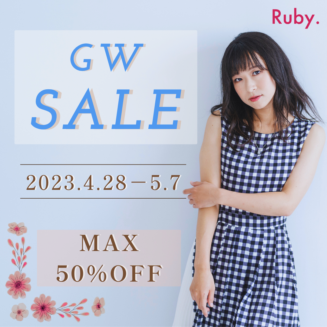 Her Tech課題架空案件アパレルECサイト yu onodera Webデザイナー ◼️依頼者 Ruby.◼️掲載媒体 Instagram サイズ1080px✖️1080px◼️入れて欲しい内容・ゴールデンウィークセール・最大50%OFF・セール期間:2023年4月28日〜5月7日