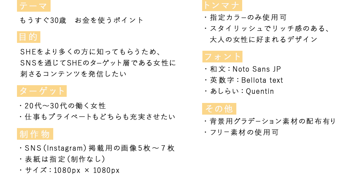 SHE株式会社様の女性向けお金のコーチングスタジオ『SHEmoney』のSNSに掲載するバナーを制作。コンペ形式で採用していただきました。 [制作時間:約10時間 使用ツール:Photoshop]