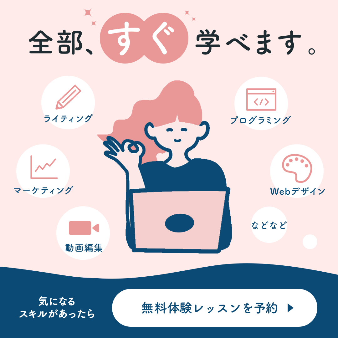 ・ライティング、マーケティングなどのスキルをアイコンで表現することでキャッチーさとライトに学べるというポジティブな印象を付けました。