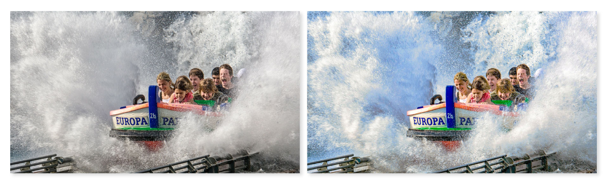 また、水に青色を着色することで、カメラではなく人間の視点で見た水の青を再現し、リアル感とポップさを演出しました。彩度も上げたことで、テーマパークらしいポップで楽しい雰囲気を出すことができました。