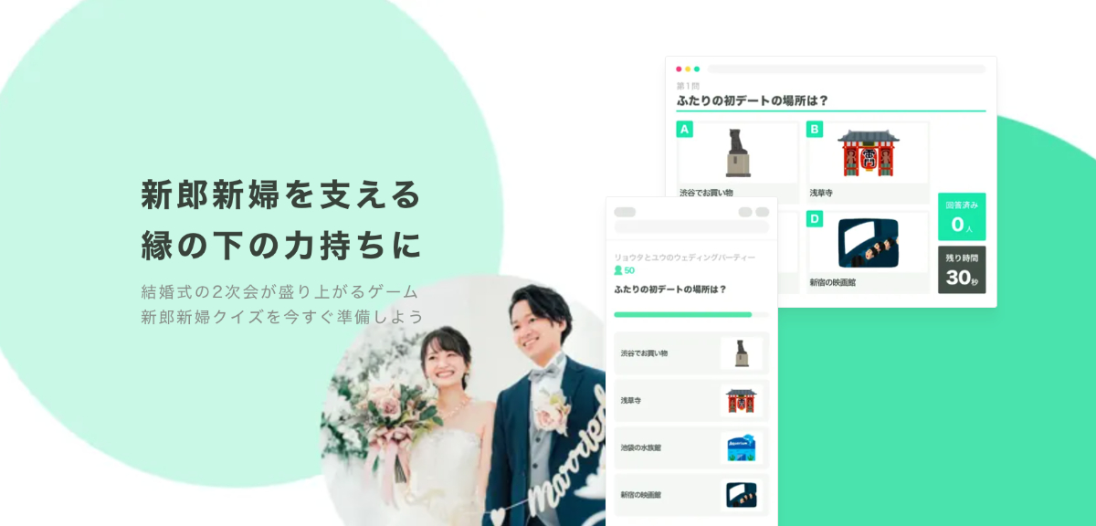 結婚式二次会やパーティーを、スマホ参加型クイズで簡単に盛り上げられるサービス。参加者がスマホから回答し、結果をリアルタイムで集計・表示することで、会場全体の一体感を生み出します。個人で企画から開発・運用までを担当し、現在までに累計11万人以上に利用されています。