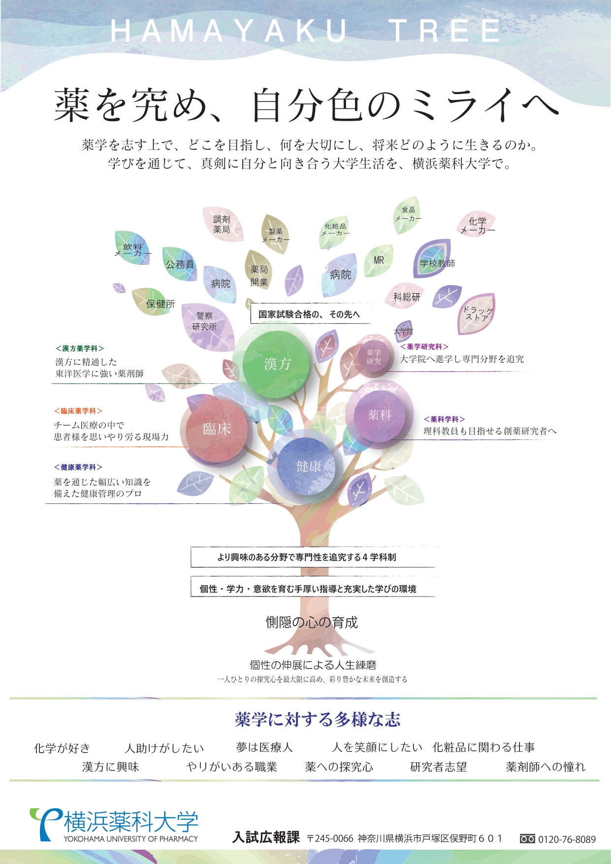 【チラシ】大学広報用チラシ in'k デザインや書きものしてます OVERVIEW 大学の特長をツリーを活用したビジュアルで表現した広報用チラシ。 YEAR 2020 <ツール>チラシ(A4)<内容>受験生に向けて大学の特長を整理して分かりやすくまとめた広報用チラシの制作。薬学部で目指せる多彩な未来を、「育成」をテーマとするツリーをモチーフに表現しました。