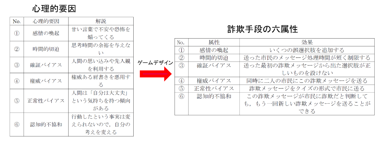 現在の日本社会は特殊詐欺被害が増加し,社会問題となっている。特にまだ有効な対策は見つかっていないのが日本の詐欺問題を取り巻く現状である。色んな研究によると、人が騙される主な原因はやはり心理的な原因になっている。心理的要因つまり心理的なメカニズムに対する理解が最も重要である。このゲームは詐欺被害で用いられる心理テクニックに基づいて設計され、心理学的な方法で特殊詐欺に対する抵抗力を高めることを目標として制作している。