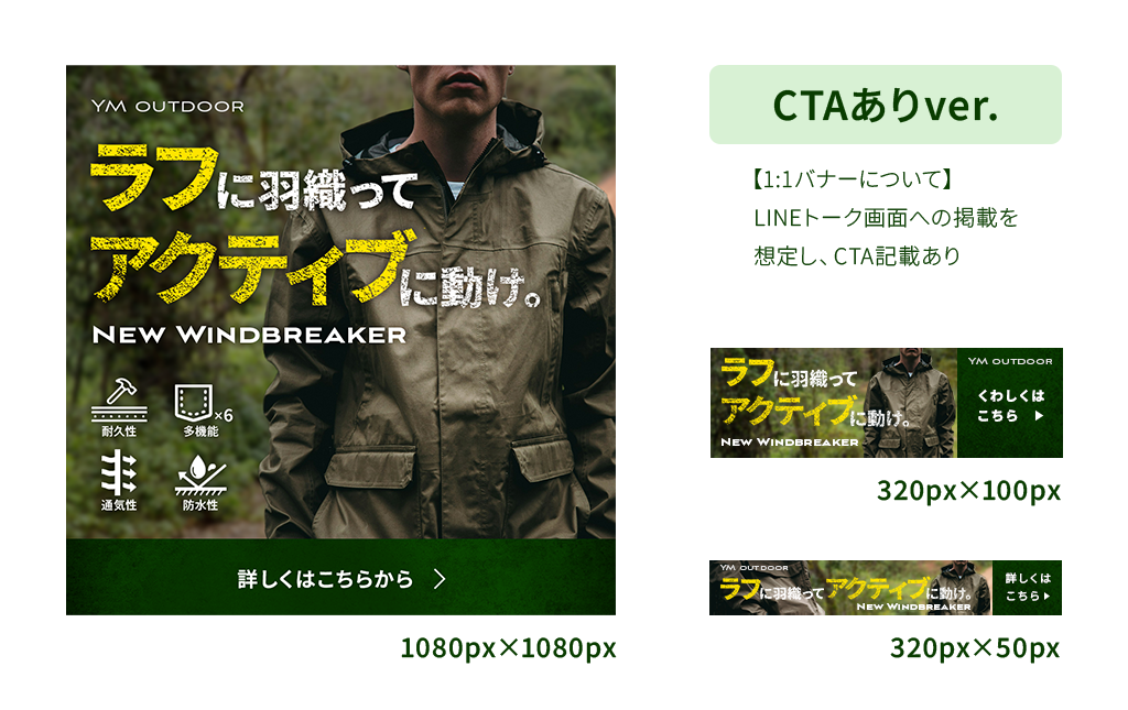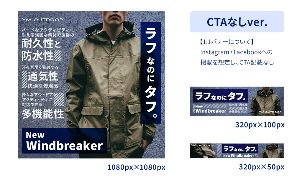 1:1のバナーについてはZ型の視線誘導を意識し、最終的にCTA部に目線がいくよう、下部に配置しました。そのほかのサイズについても、左から右への視線の動きに合わせて、右側にCTAを配置しました。