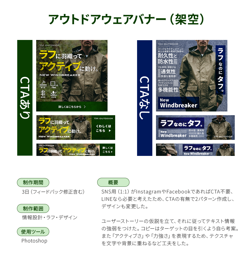 クライアントの要望から深い緑をメインに使用。中でも、アウトドアウェアであるため自然に存在するような緑を使用しました。暗く後退して見えるメインカラーに対し、明るく進出して見える黄色を使用して、コピーを目立たせました。