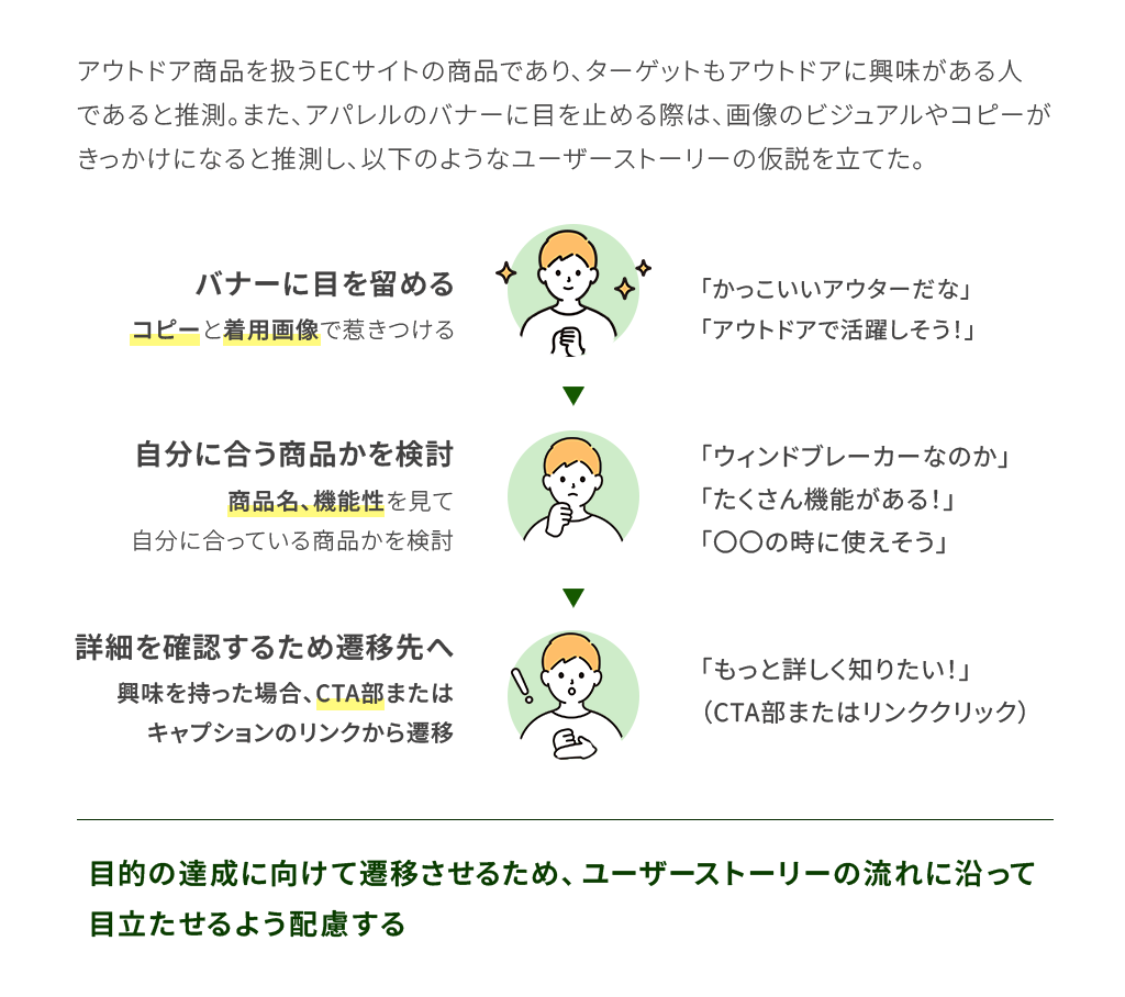 ユーザーストーリーの仮説に従い、まずは着用画像とコピーで引き付けられるよう、フォントサイズを大きく配置。またこの商品においてキーワードとなるような単語を黄色にして目立たせました。