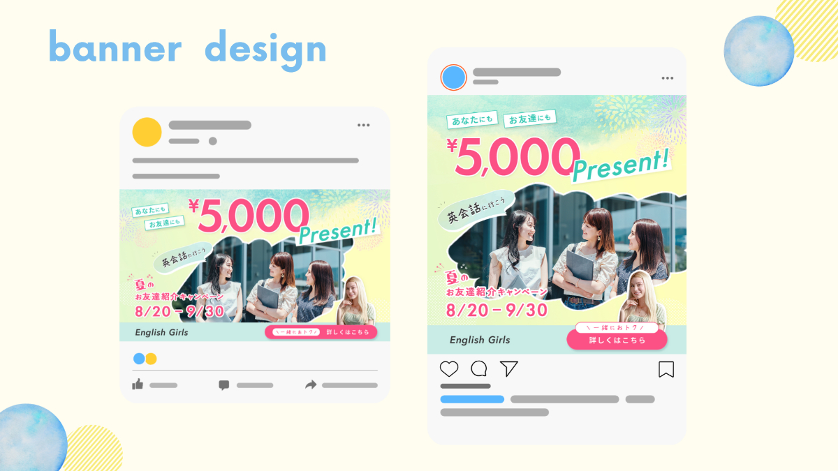 必須画像:「あなたとお友達」を表現する人物写真、英会話スクールであることがわかる要素、English Girlsのロゴ(色変更可)
