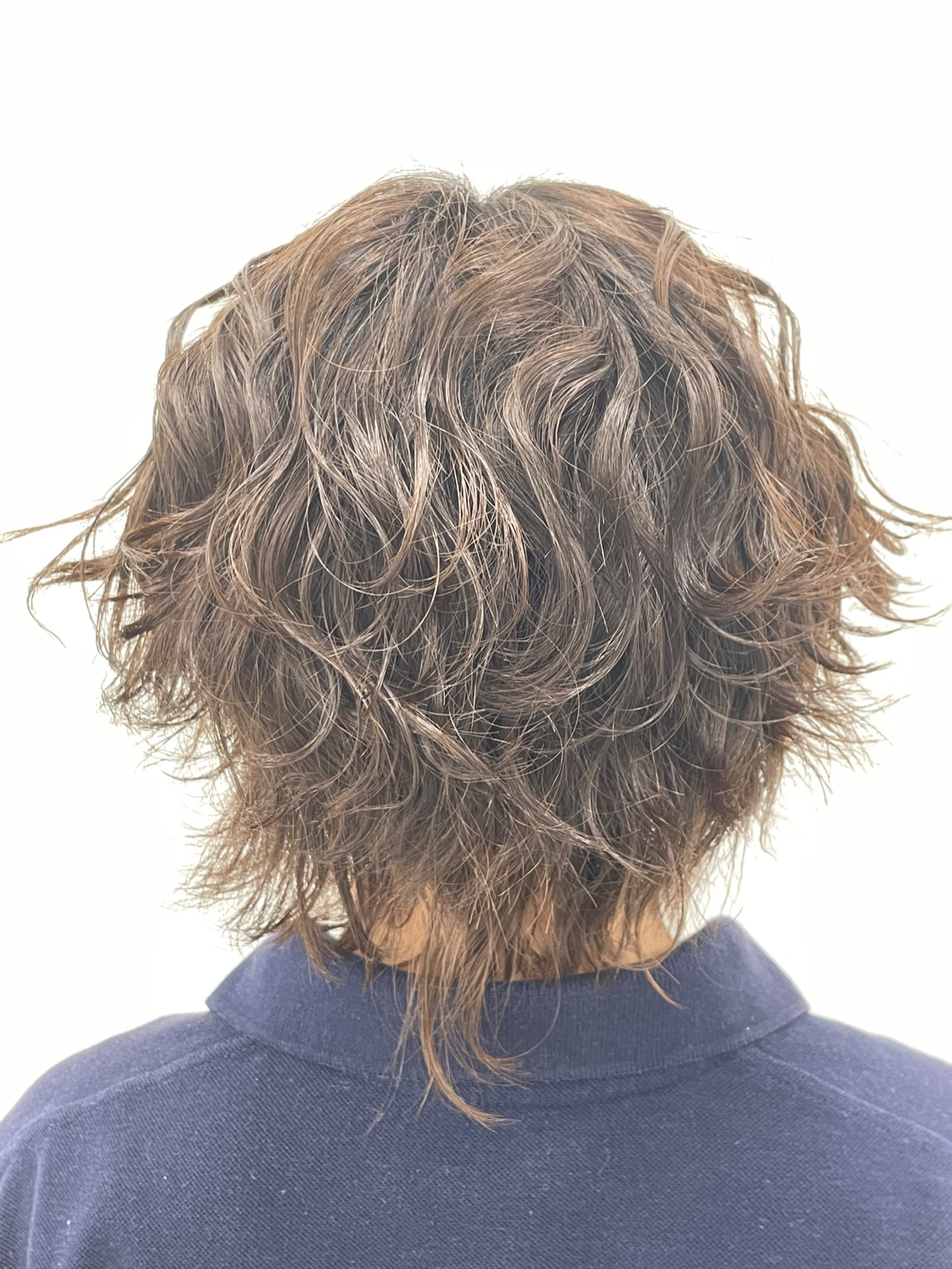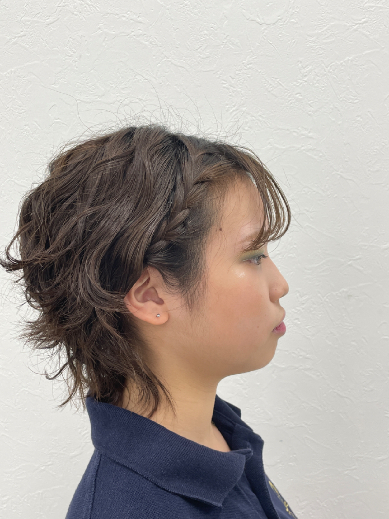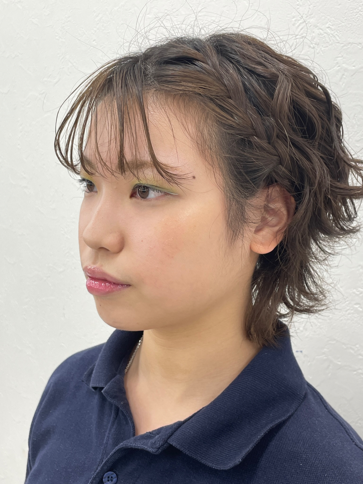 ヘアーは両サイドフロント部分に編み込みをして後ろに毛先を隠しました。全体をウェーブにして動きを出し、オイルをたっぷりつけて束感を出しました。
