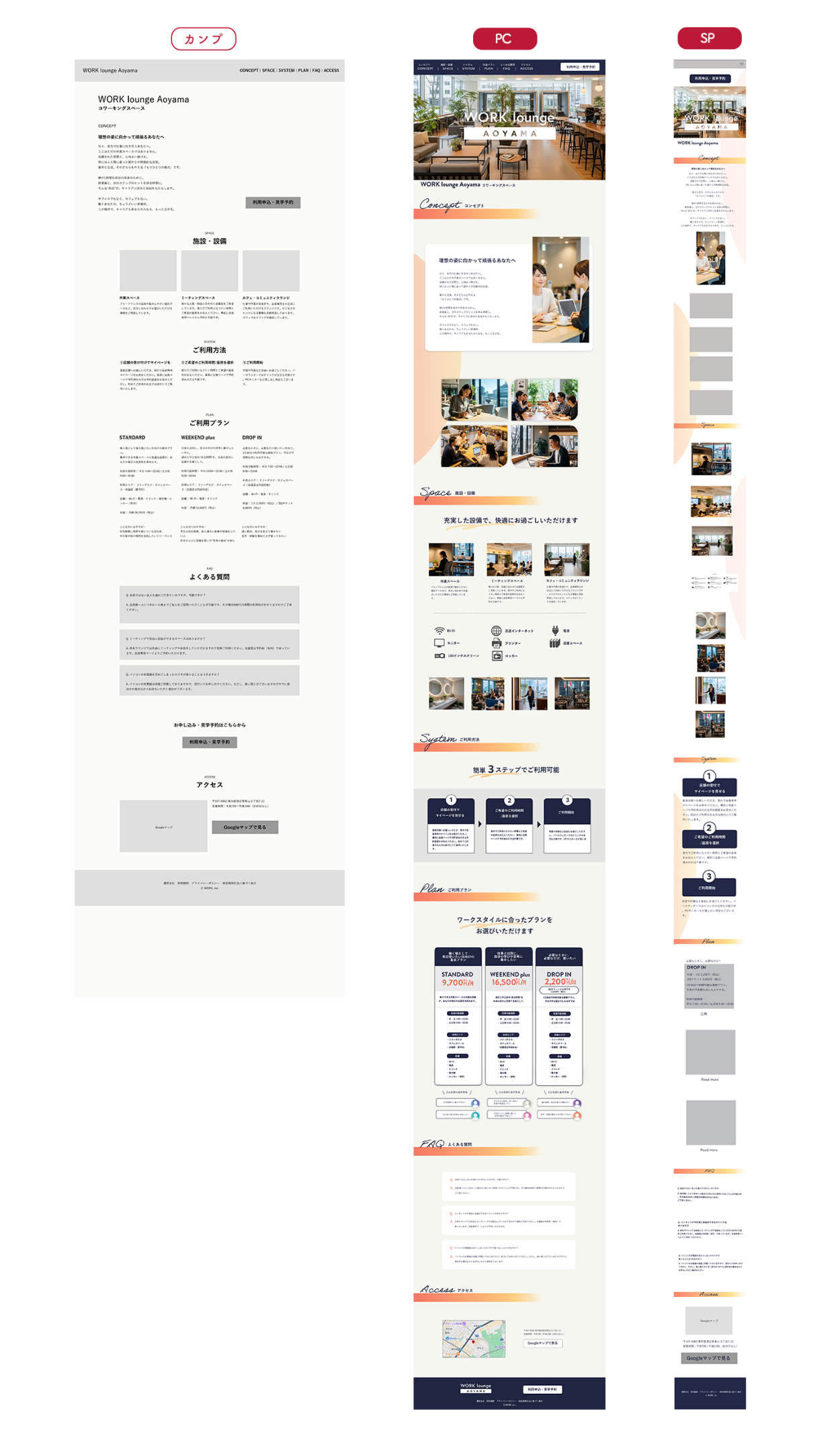 SHElikes PRO デザイナーコース にて 会員専用カフェ&コワーキングスペース(架空)の LP制作を行いました。 PC デザインカンプ、SP ワイヤーフレーム [制作時間:24H / 使用ツール:Photoshop]