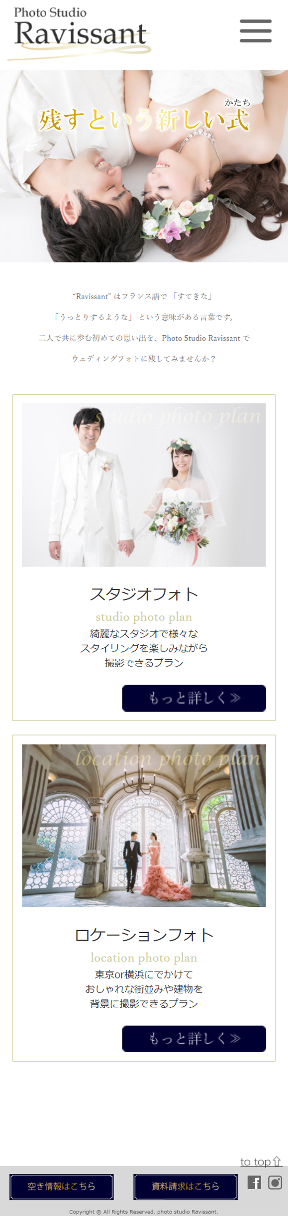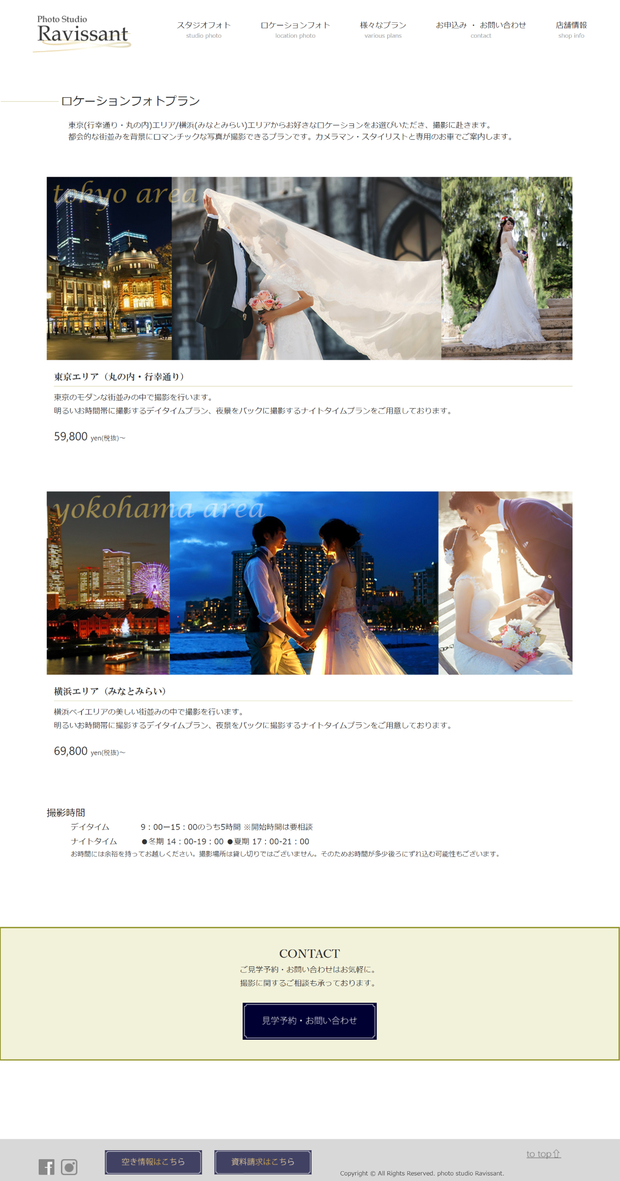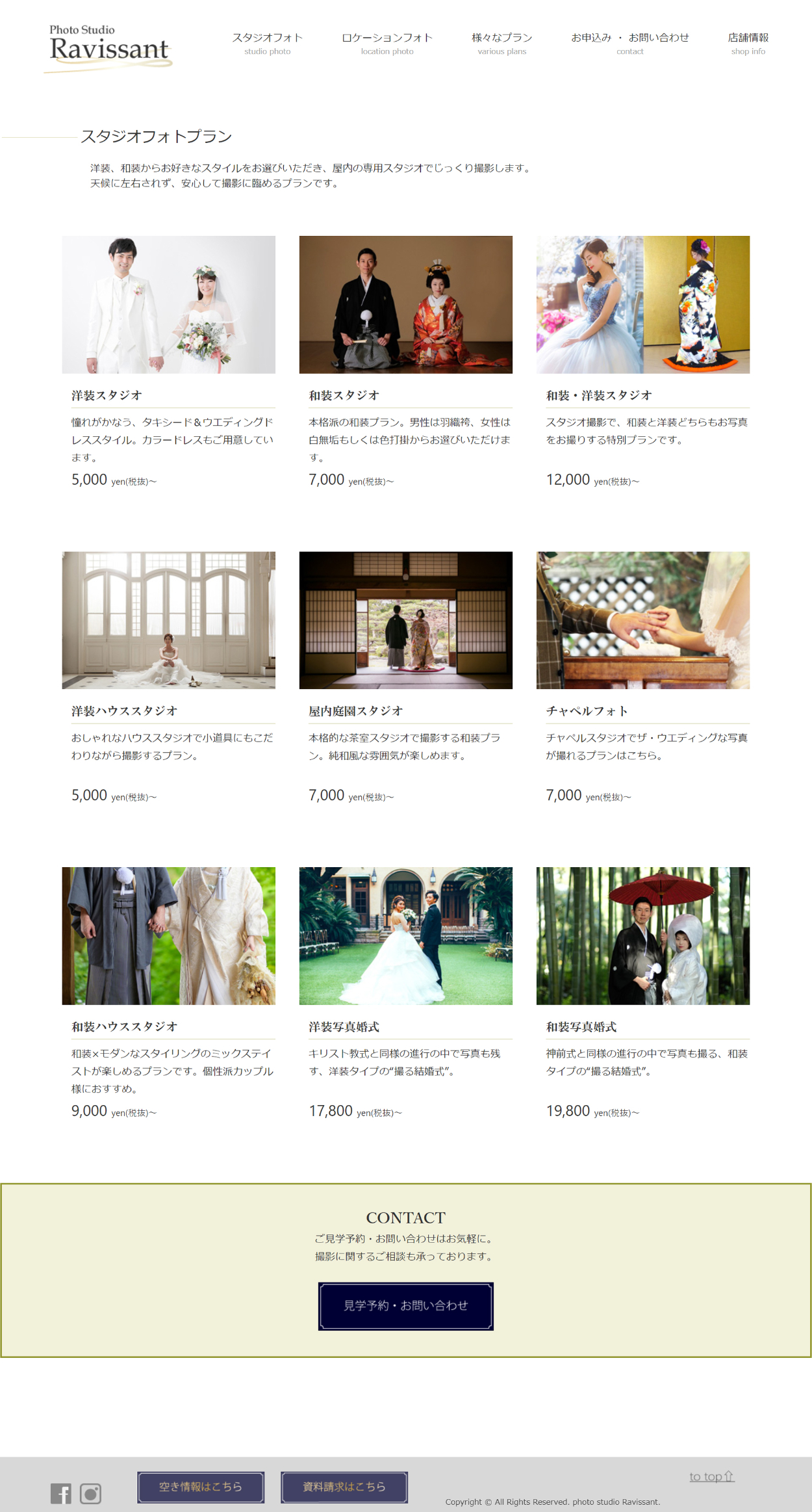 架空webサイト Photo Studio Ravissant(フォトスタジオ ラヴィサントゥ) 職業訓練校 グループ制作課題 …訓練生3名で、課題の前提条件とクライアント役のグループの要望を踏まえ、9日間で全6ページの架空WEBサイトを制作しました。