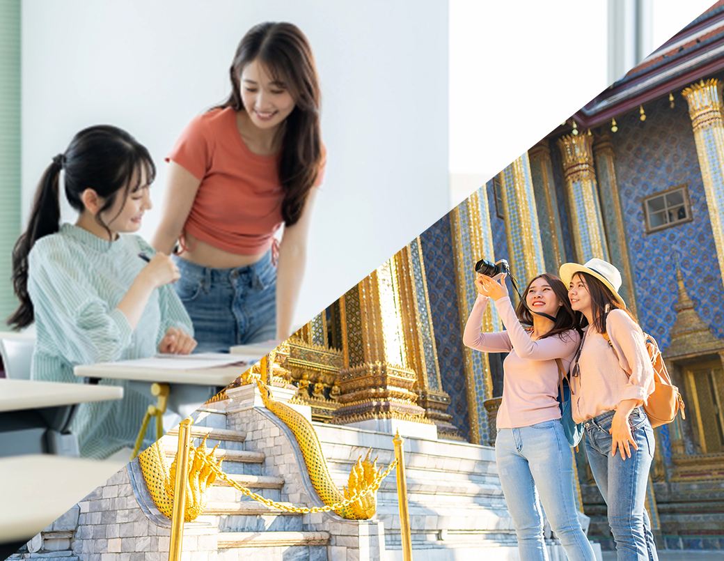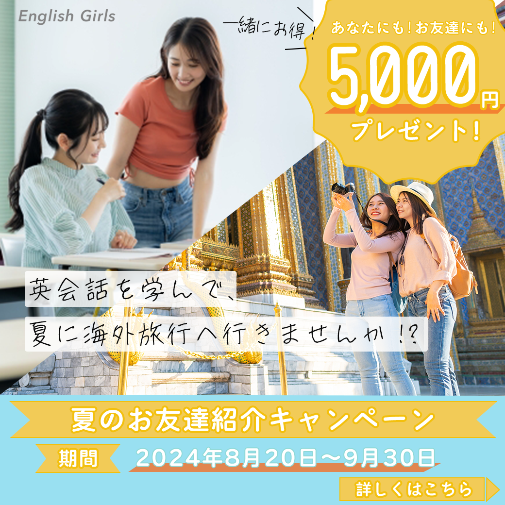 『夏』『お友だちキャンペーン』ということで、友だちと一緒に勉強をしている画像を選びました。また、自分なりに英会話を夏に学ぶ理由とはなんだろうと考え、『友だちと一緒に海外旅行へ行くという目的』を作り、友だちと海外旅行している画像を選び、友だちと英会話を学び、海外旅行に行ったというイメージで画像を配置しました。