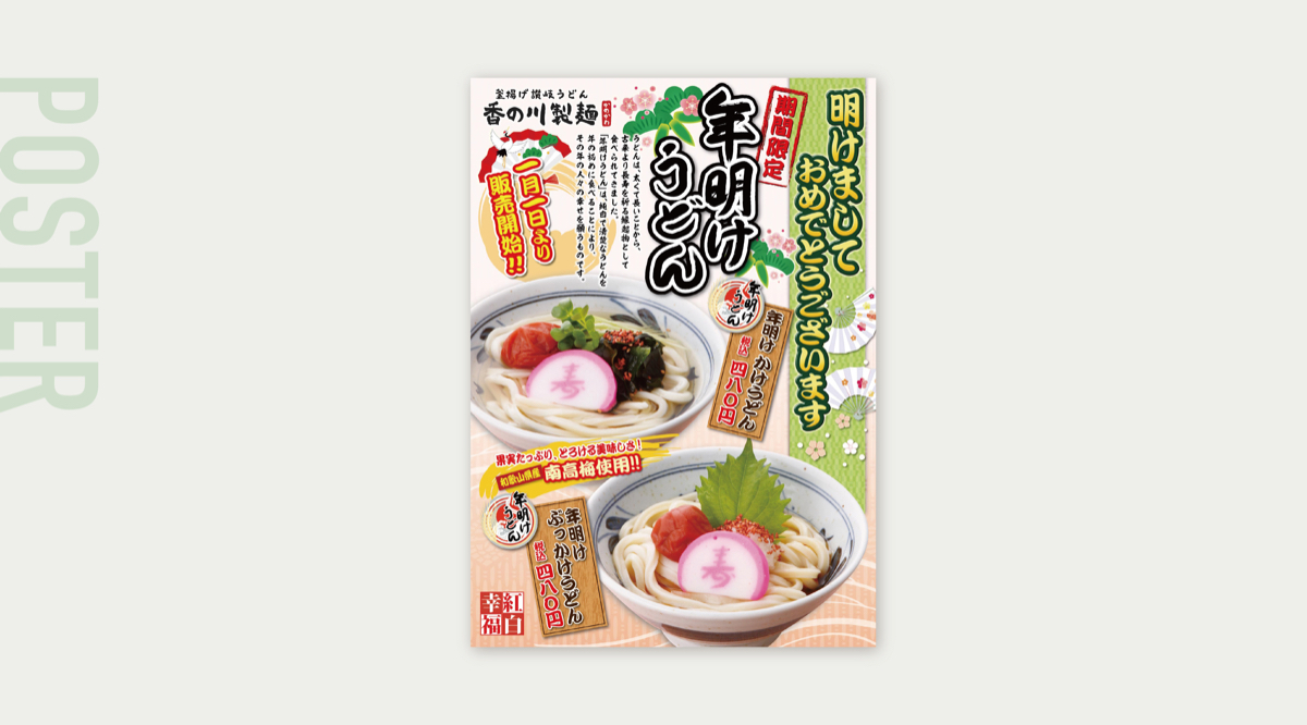 【ポスター】季節限定商品 渡利 亜有子 グラフィックデザイナー ●ツール / B2サイズ 店内ポスター● 内容 / 3ヶ月に1度の新商品発売告知ポスター年明けにうどんは縁起が良い(白く細く長く)とのクライアント様の案で制作しました。